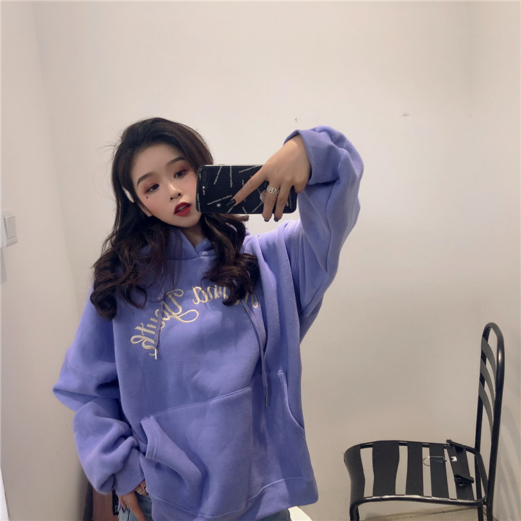港味慵懶風上衣女寬松復古刺繡英文連帽加絨百搭慵懶衛衣女秋新款