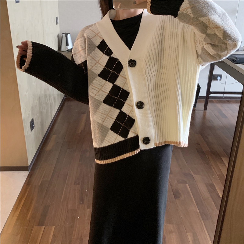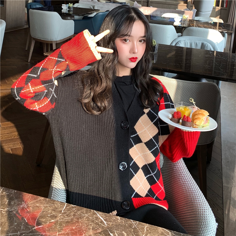 / 撞色格子慵懶風寬松網紅毛衣女2018新款復古韓版時尚針織開衫外套