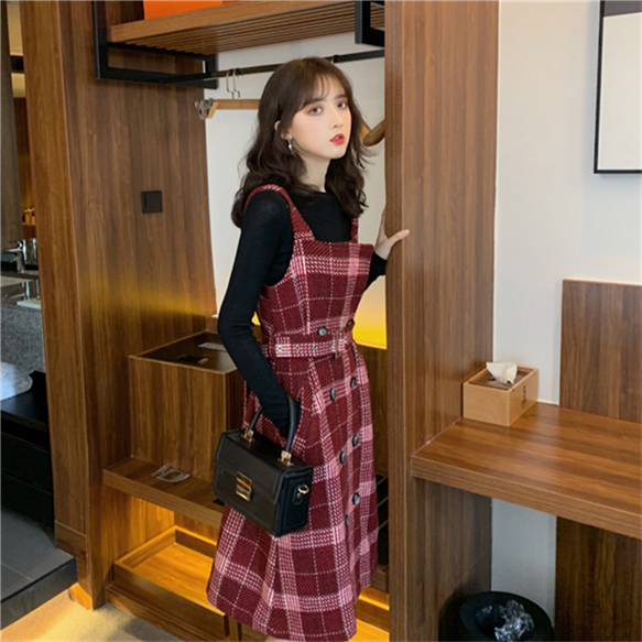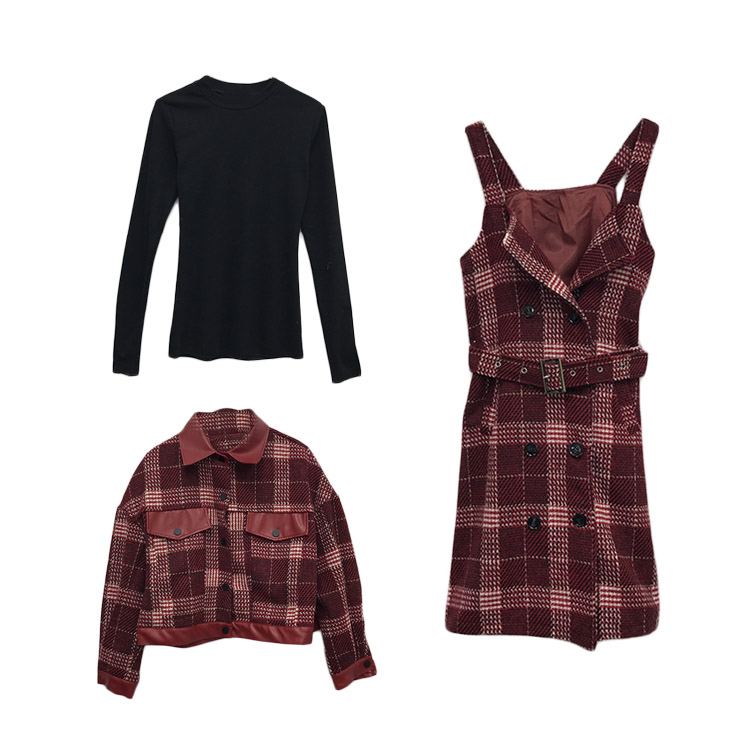姐妹裝格子拼接短款呢子外套+收腰背心呢子連衣裙女秋裝2018新款