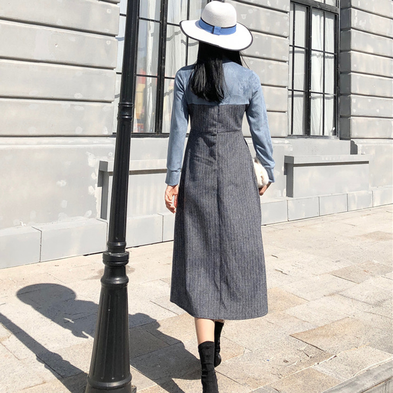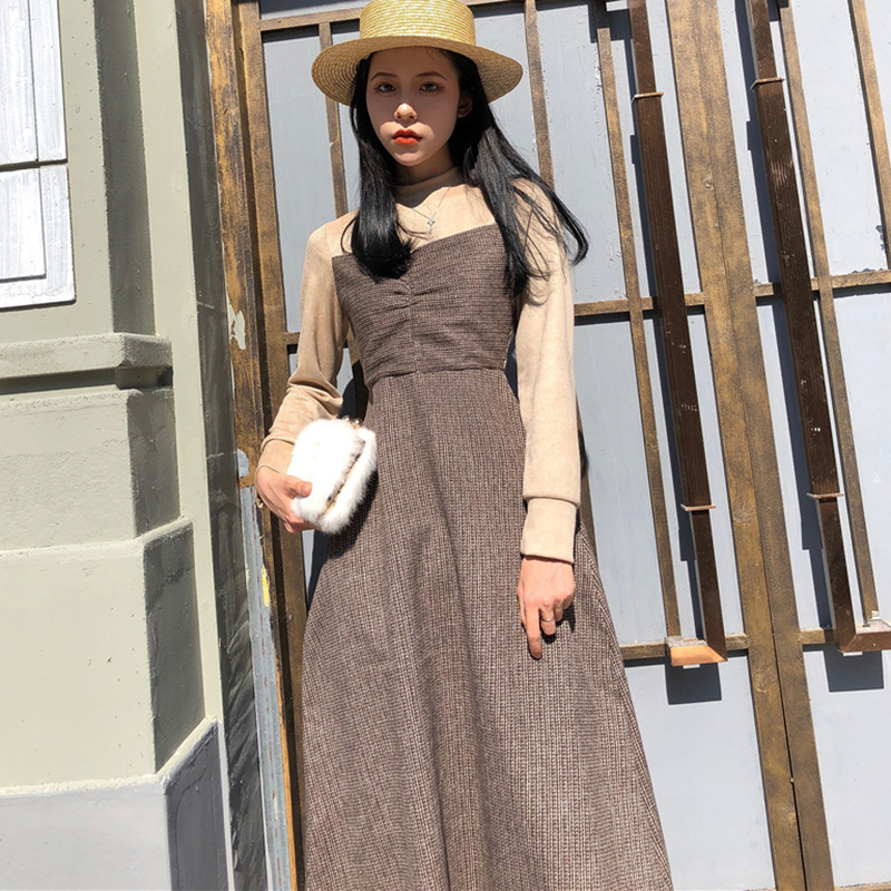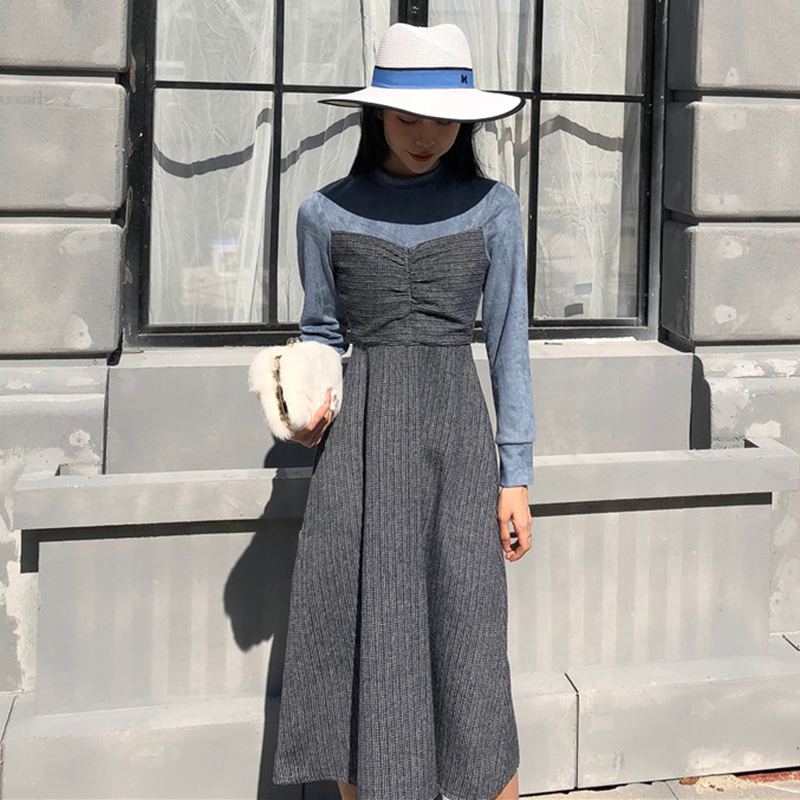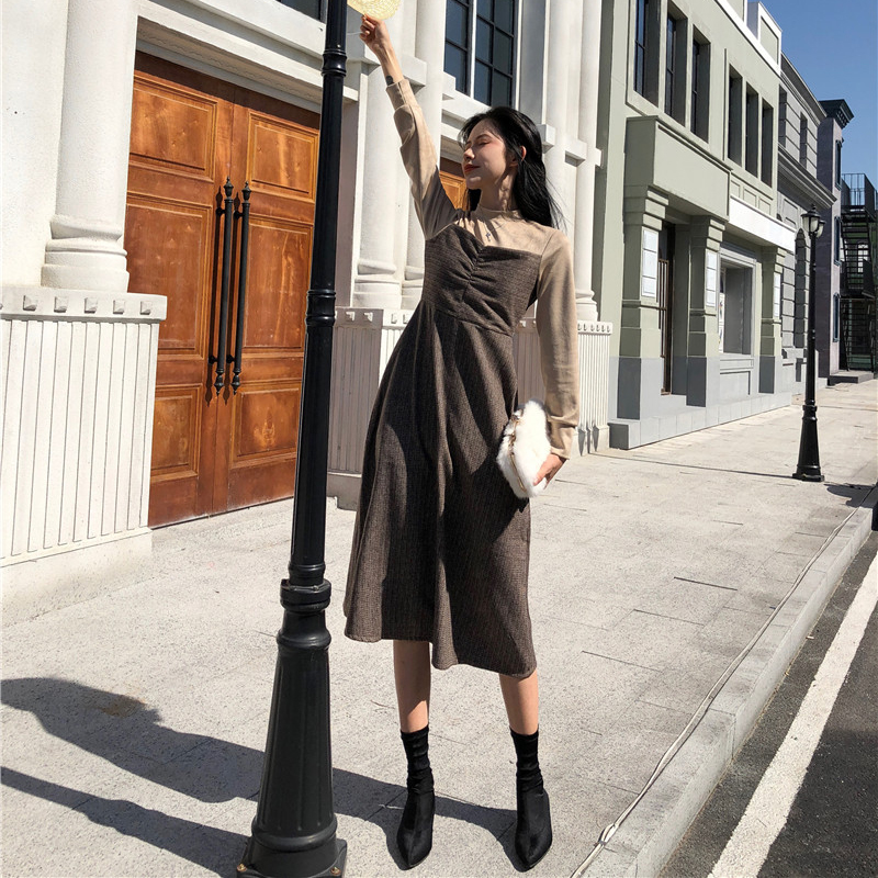 / 拼色彈力格子假兩件連衣裙子女秋冬裝新款高腰顯瘦長袖egg桔梗裙