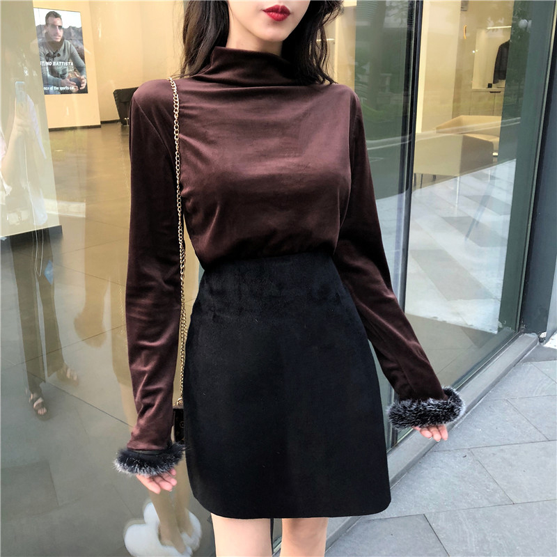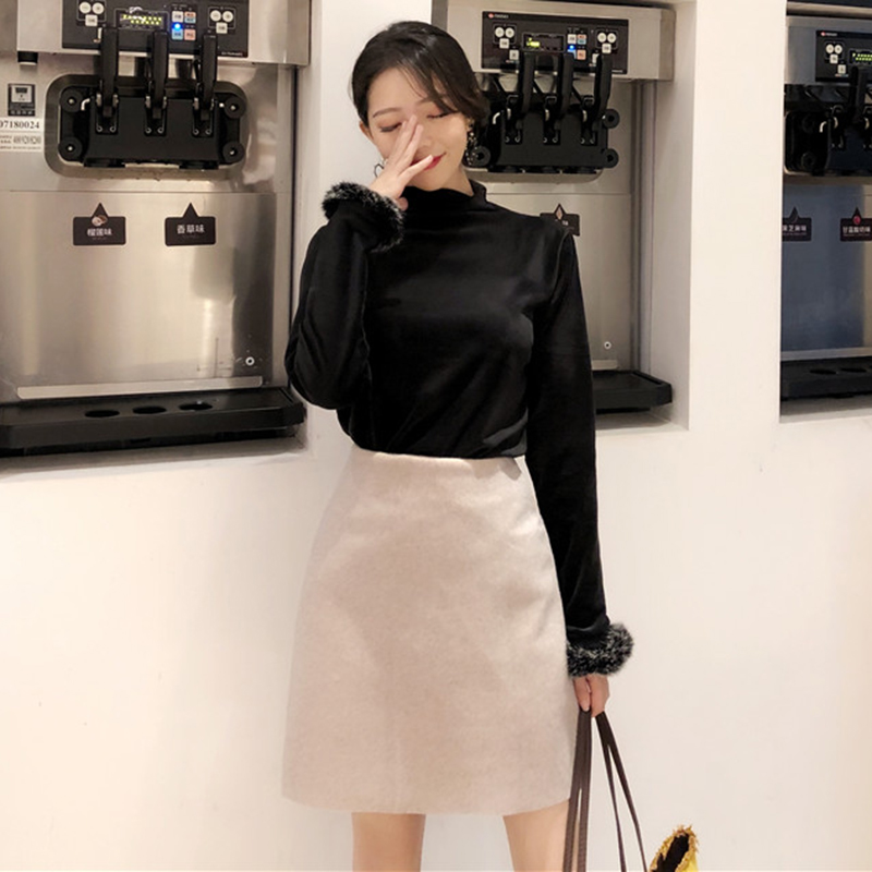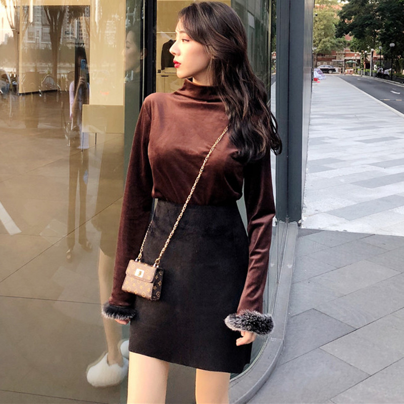 赫本風套裝女秋冬新款毛毛袖修身打底衫上衣高腰顯瘦黑色半身裙子