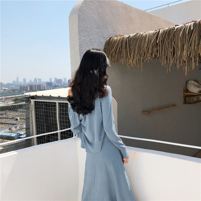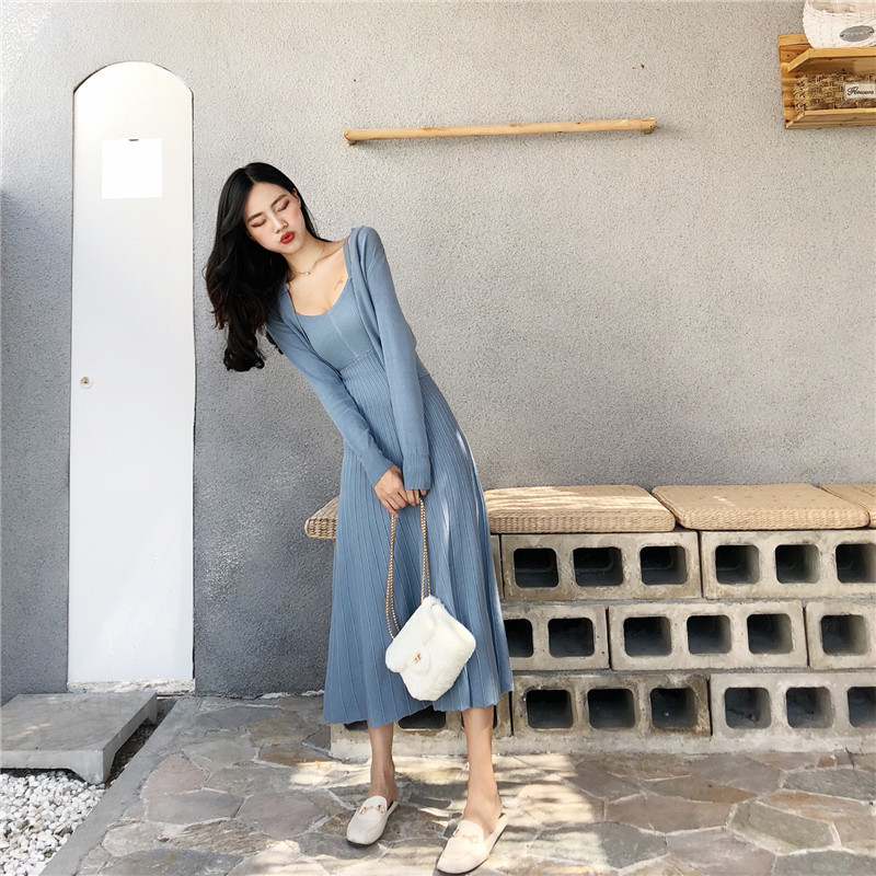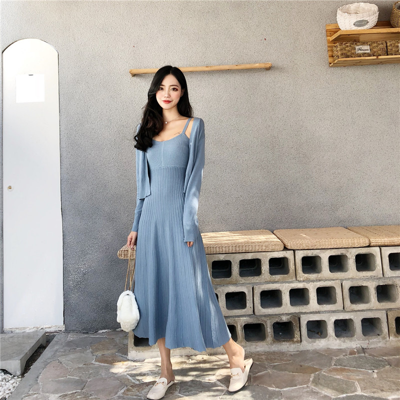 / 韓國秋裝女2018新款套裝時尚兩件套修身氣質針織開衫+吊帶連衣裙