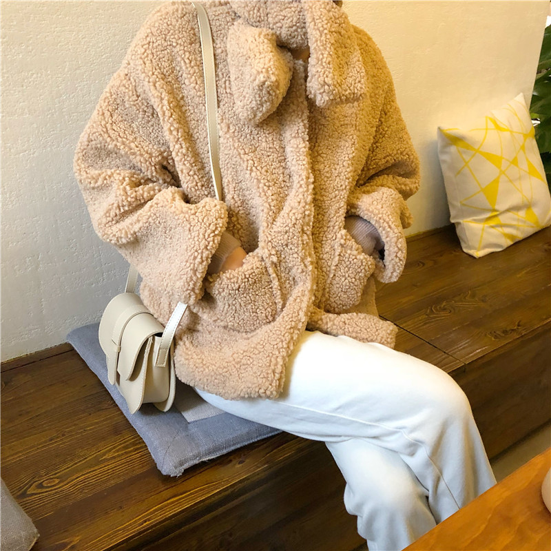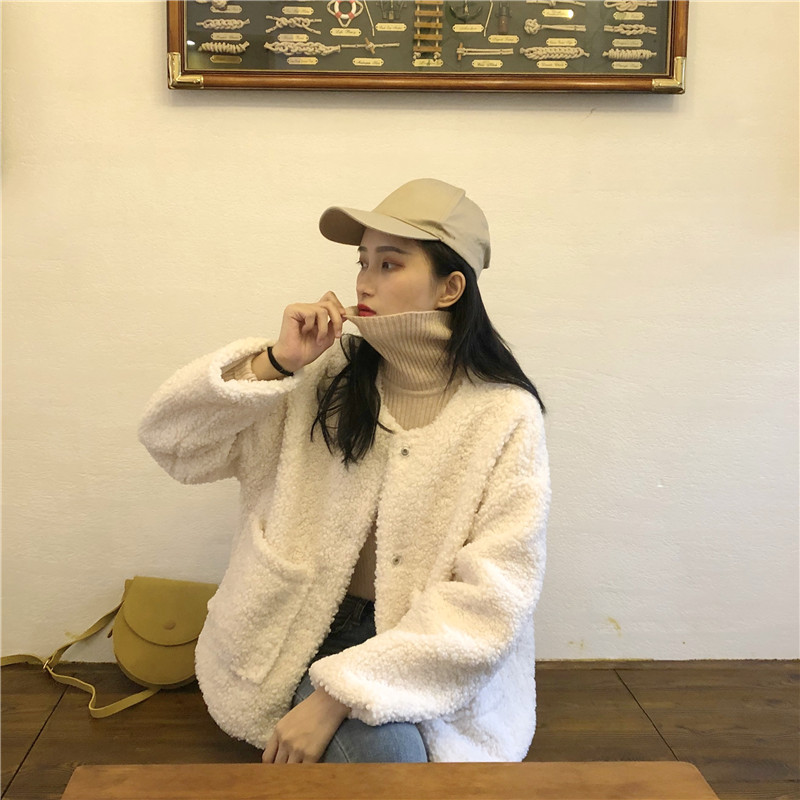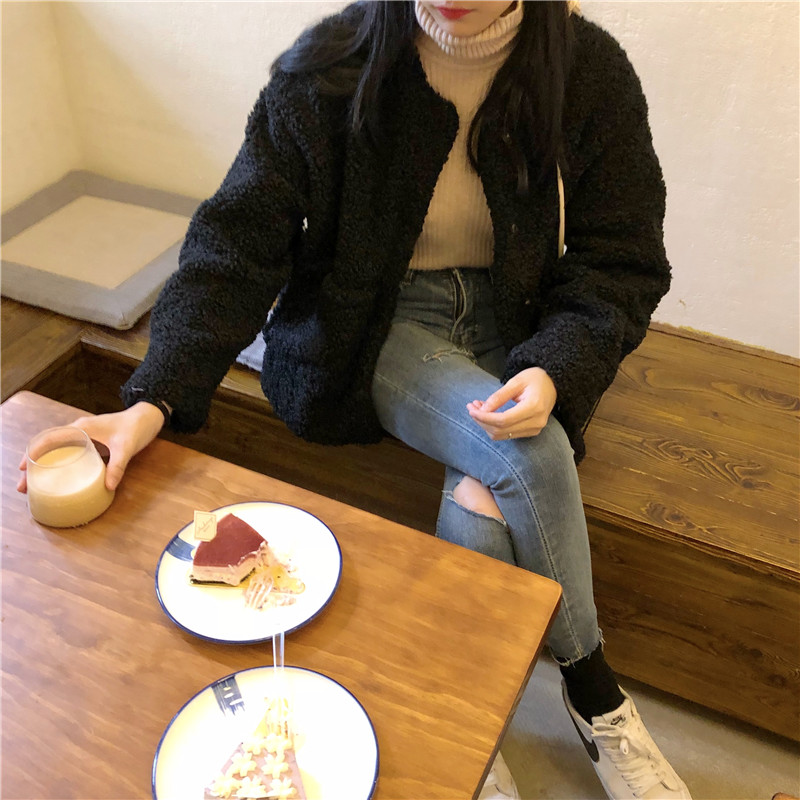 冬季新款韓版女裝百搭chic加厚保暖羊羔毛長袖短外套女絨衫配圍巾