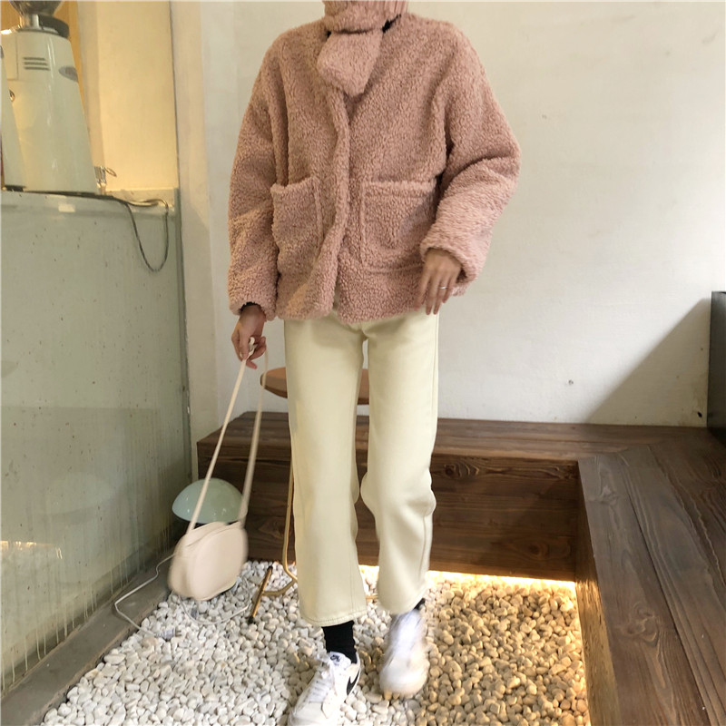 / 冬季新款韓版女裝百搭chic加厚保暖羊羔毛長袖短外套女絨衫配圍巾