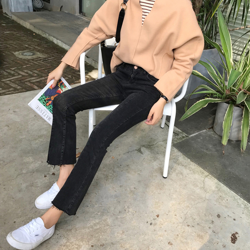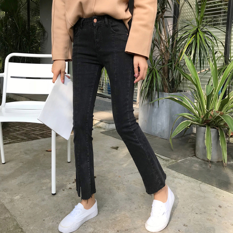 / 秋冬新款女裝彈力高腰修身顯瘦褲腳開叉氣質黑色微喇九分牛仔褲女