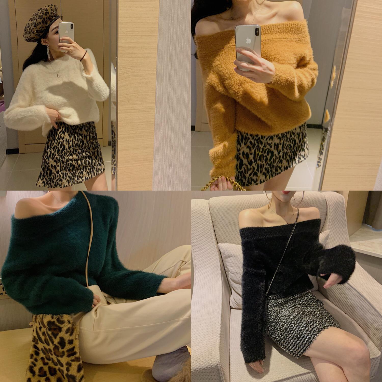 / 韓版長毛水貂絨一字領短款加厚露肩寬松毛衣女秋冬2018新款針織衫