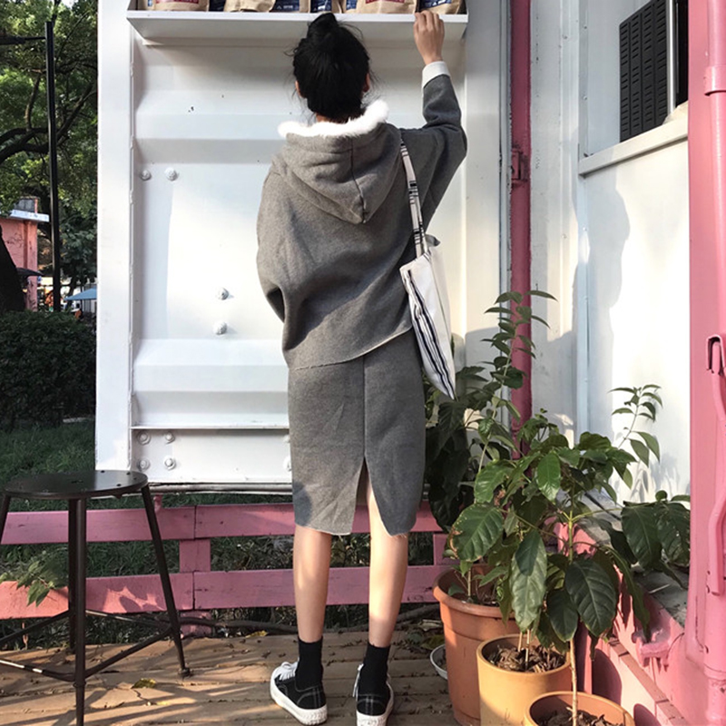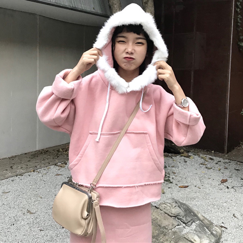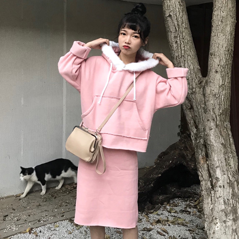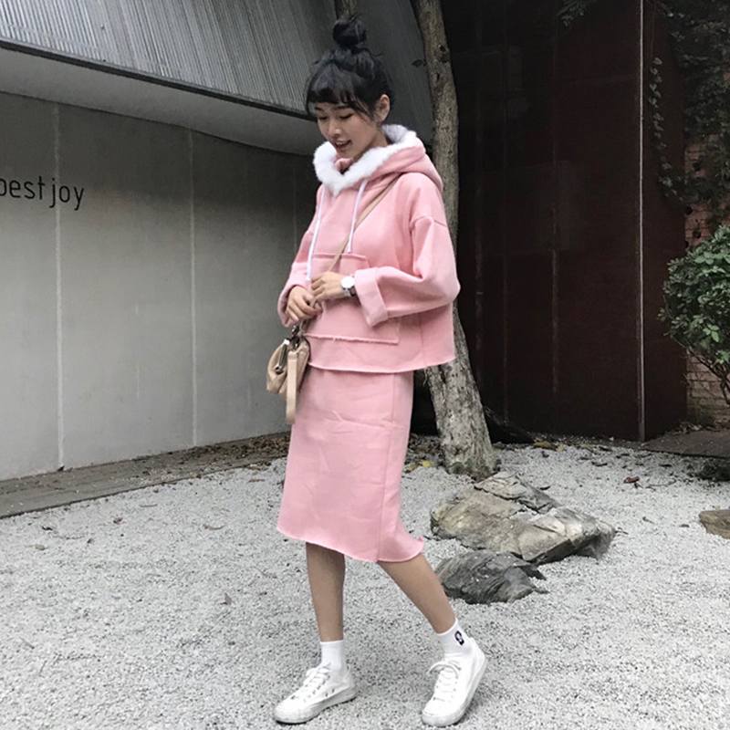 / 時尚套裝女秋冬新款加絨休閑連帽衛衣復古風高腰顯瘦包臀半身裙子