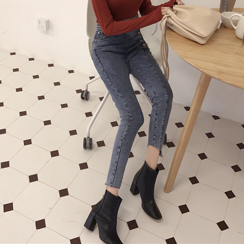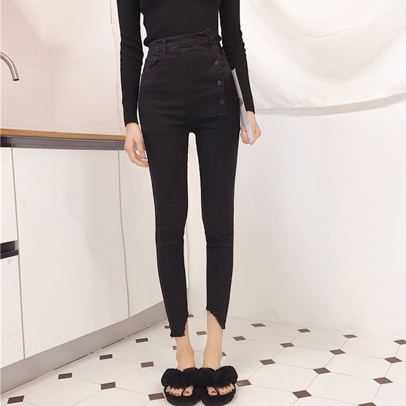 / 不規則排扣緊身高腰牛仔褲秋裝女2018新款修身彈力小腳鉛筆褲子潮