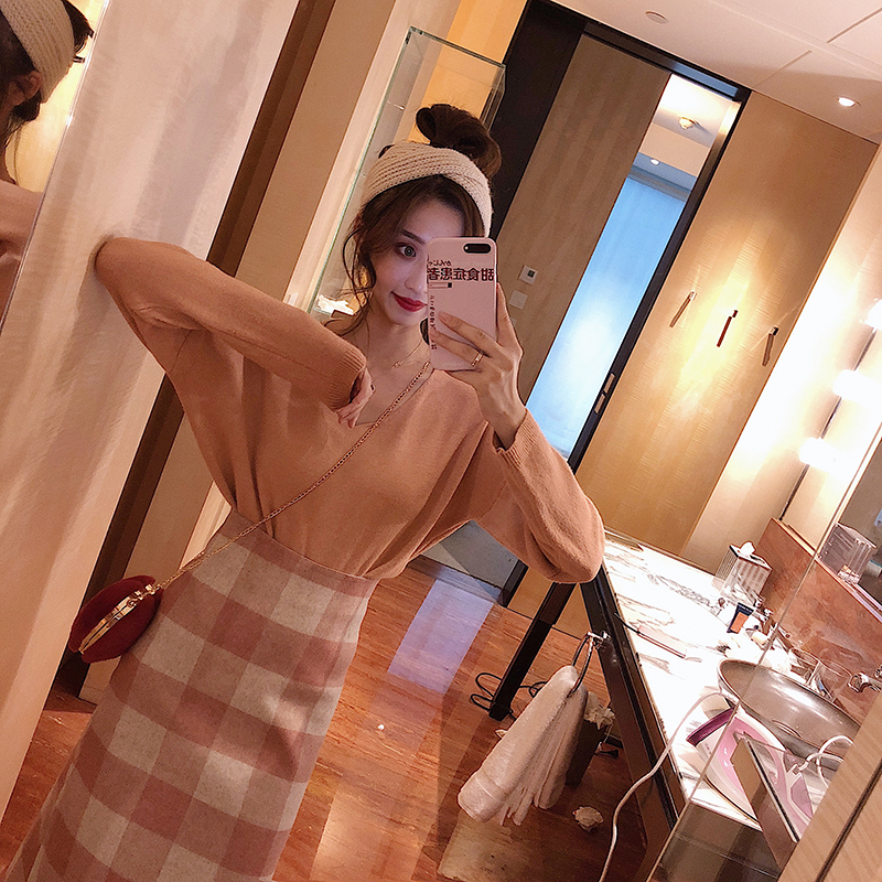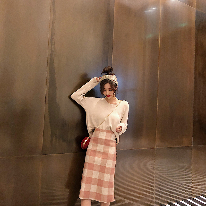 女神套裝秋冬款高腰顯瘦針織半身中裙+溫柔慵懶寬松厚實開衫毛衣