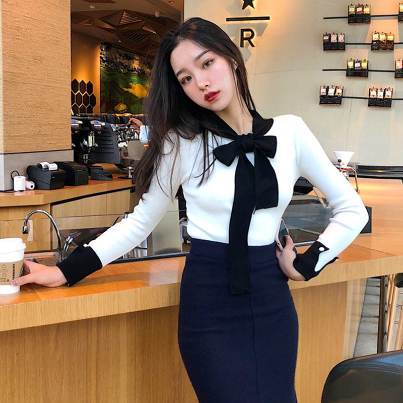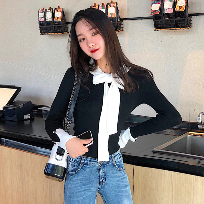 / 毛衣女2018新款秋裝港味復古蝴蝶結上衣氣質修身打底衫長袖針織衫