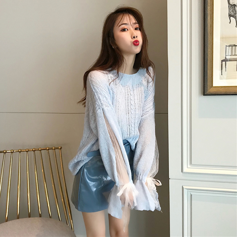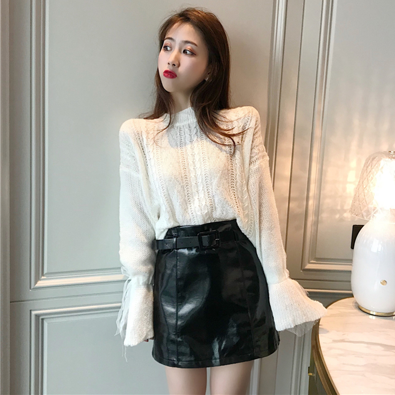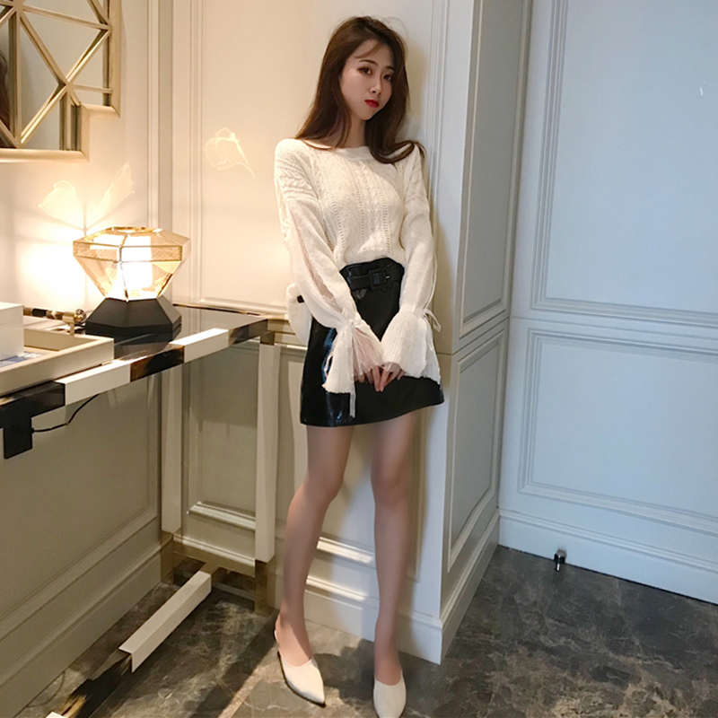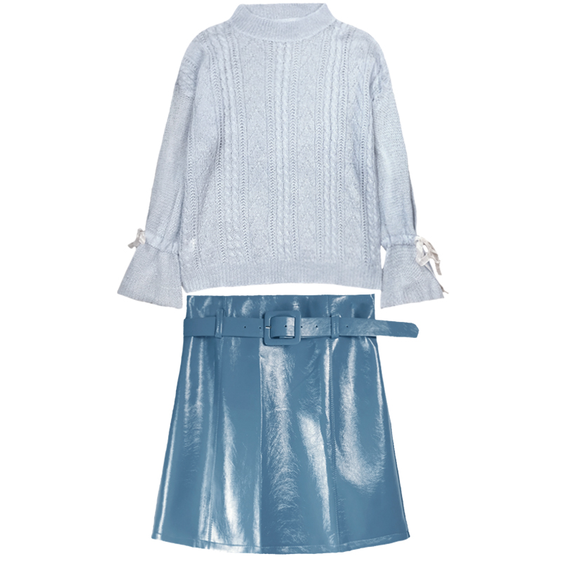 / 時尚套裝女秋新款喇叭長袖假兩件針織毛衣PU皮高腰顯瘦A字短裙子