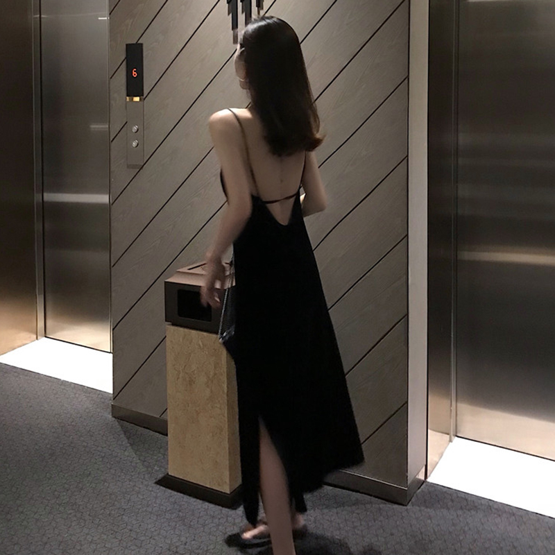 / 復古氣質絲絨黑裙子秋裝女2018新款時尚露背吊帶連衣裙打底中長裙