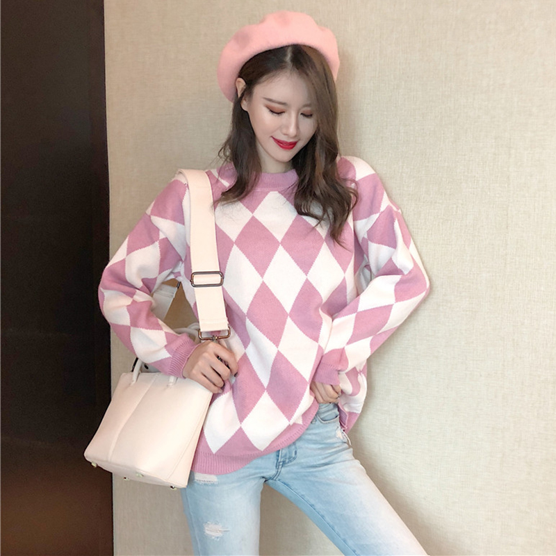 chic小清新百搭菱格毛衣外套女秋冬裝2018新款韓版寬松套頭針織衫