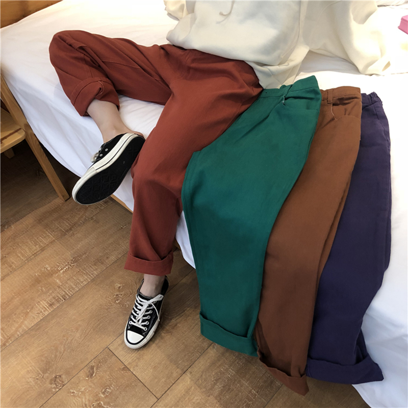 / 復古高腰顯瘦休閑褲子女秋冬裝新款韓版學生純色寬松直筒卷邊長褲