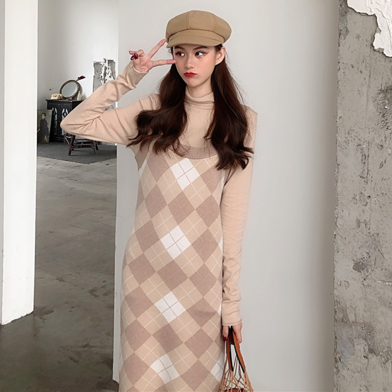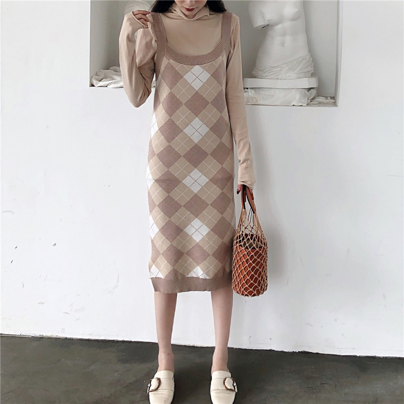 學院風撞色菱格針織裙女秋冬裝2018新款韓版中長款背心連衣裙子潮