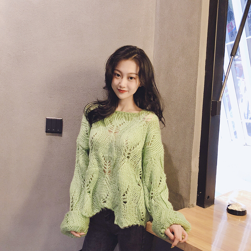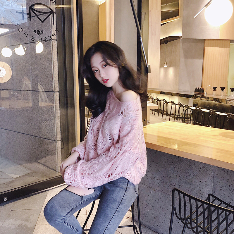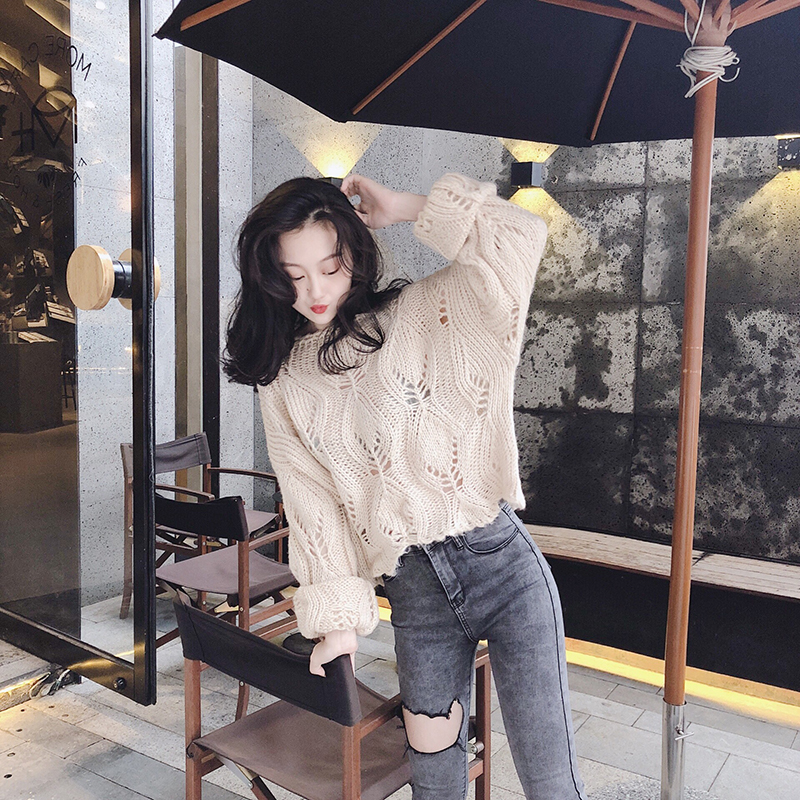 韓版時尚秋裝女2018新款氣質百搭圓領毛衣寬松顯瘦針織衫鏤空上衣