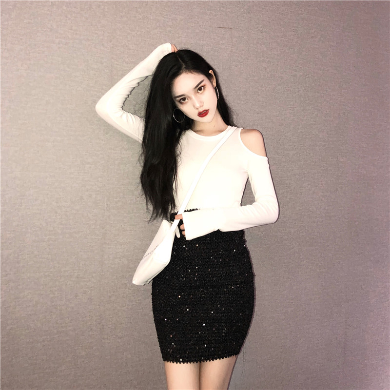 / 韓國復古風秋裝女2018新款修身顯瘦露肩T恤+高腰針織包臀半身裙潮