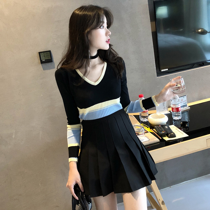 / 港味復古V領條紋修身針織衫秋裝女2018新款長袖短款時尚打底上衣