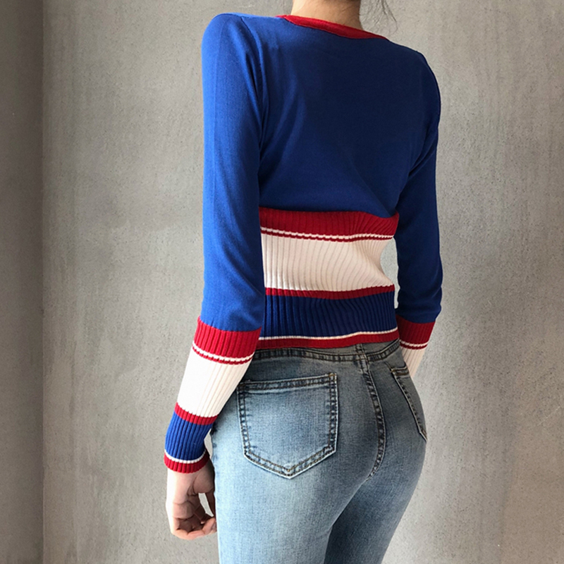 港味復古V領條紋修身針織衫秋裝女2018新款長袖短款時尚打底上衣