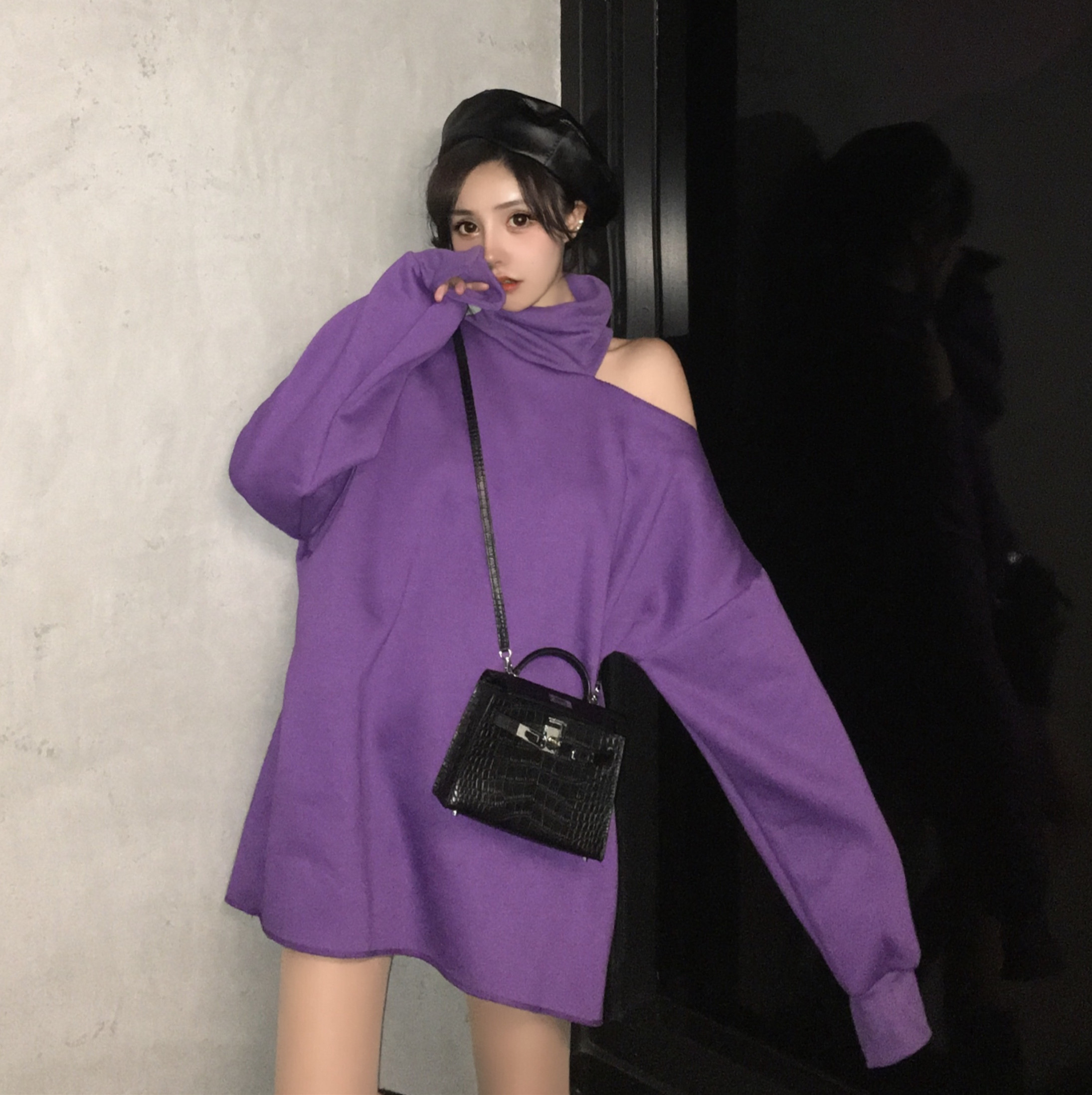 chic早秋上衣慵懶中長款純色衛衣女秋2018新款高領加絨露肩掛脖女