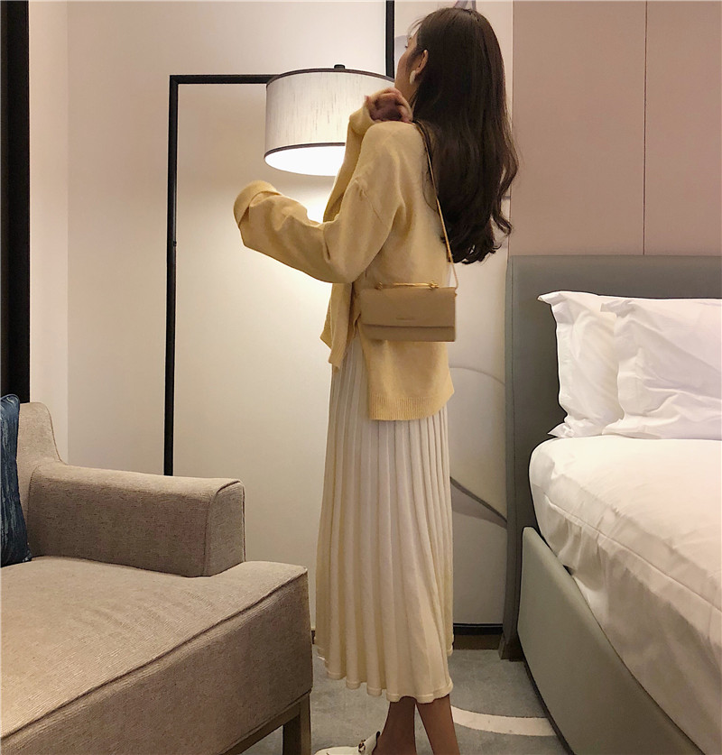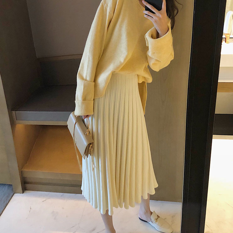 / 女神套裝秋慵懶風毛衣套頭長袖針織衫+復古寬松中長款百褶半身裙