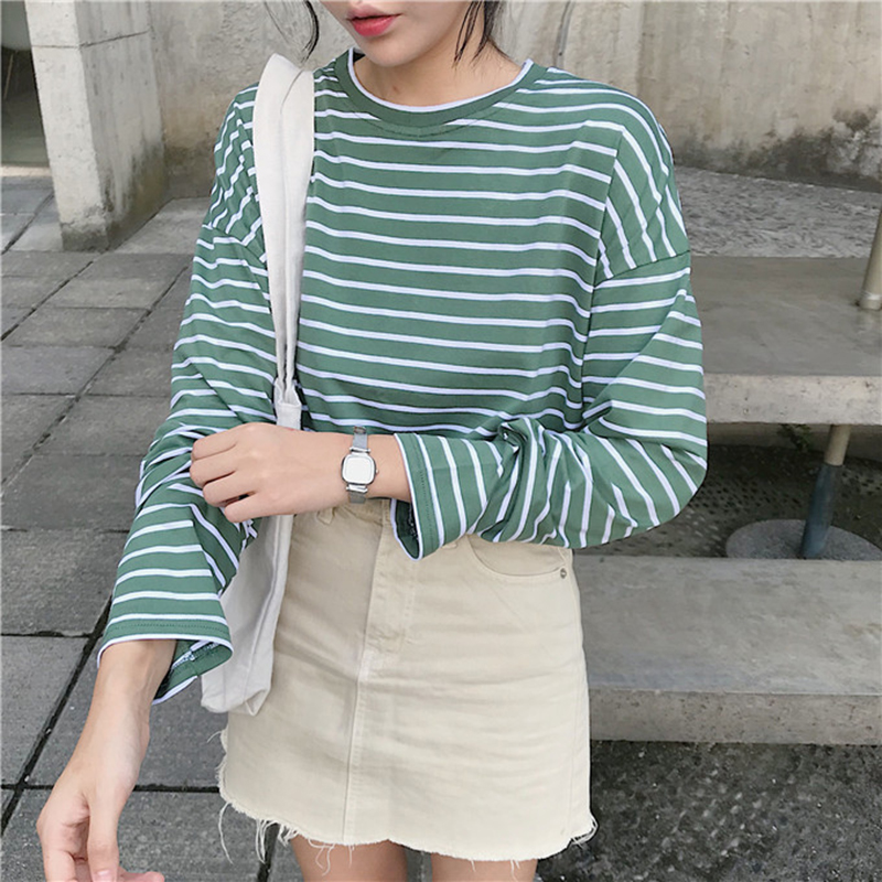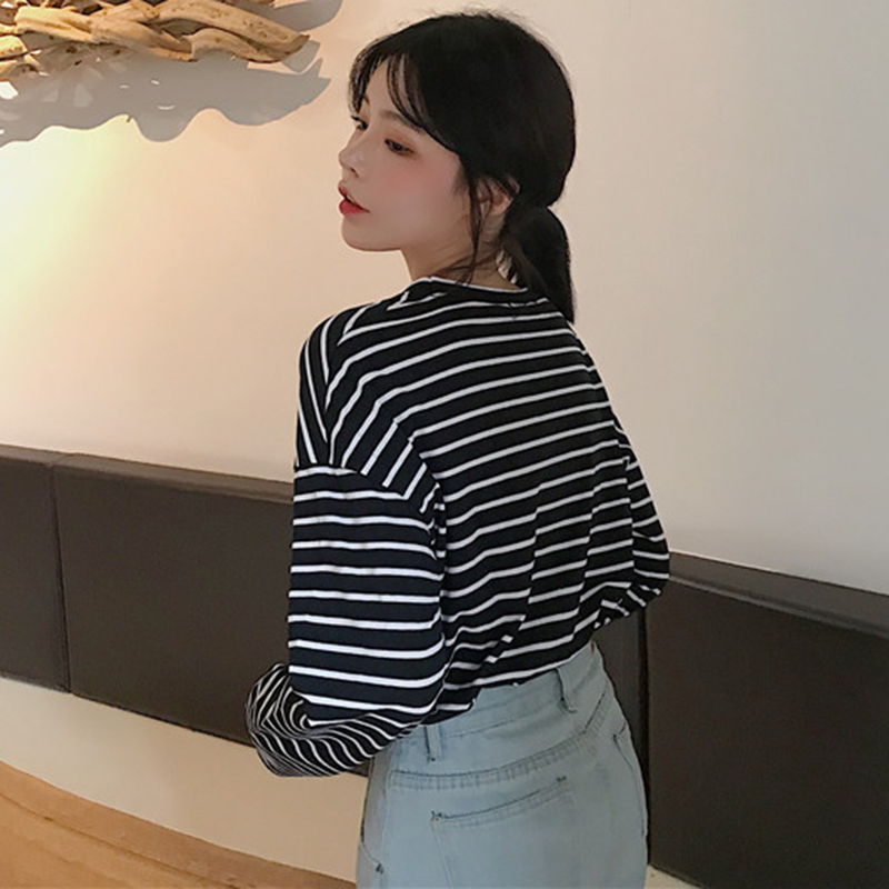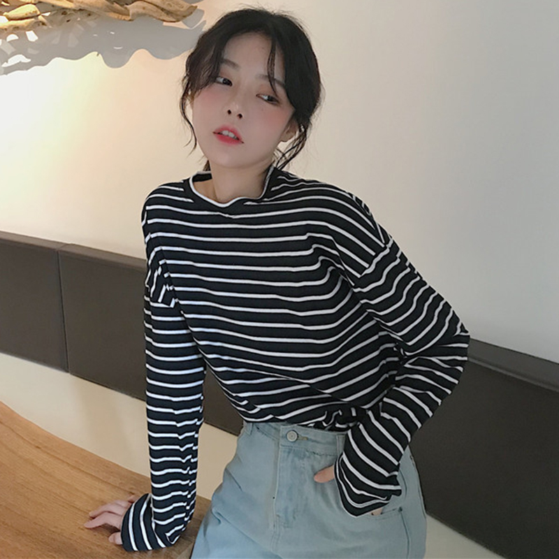 / 小清新長袖T恤女秋裝2018新款韓版學生黑白條紋上衣寬松時尚體恤