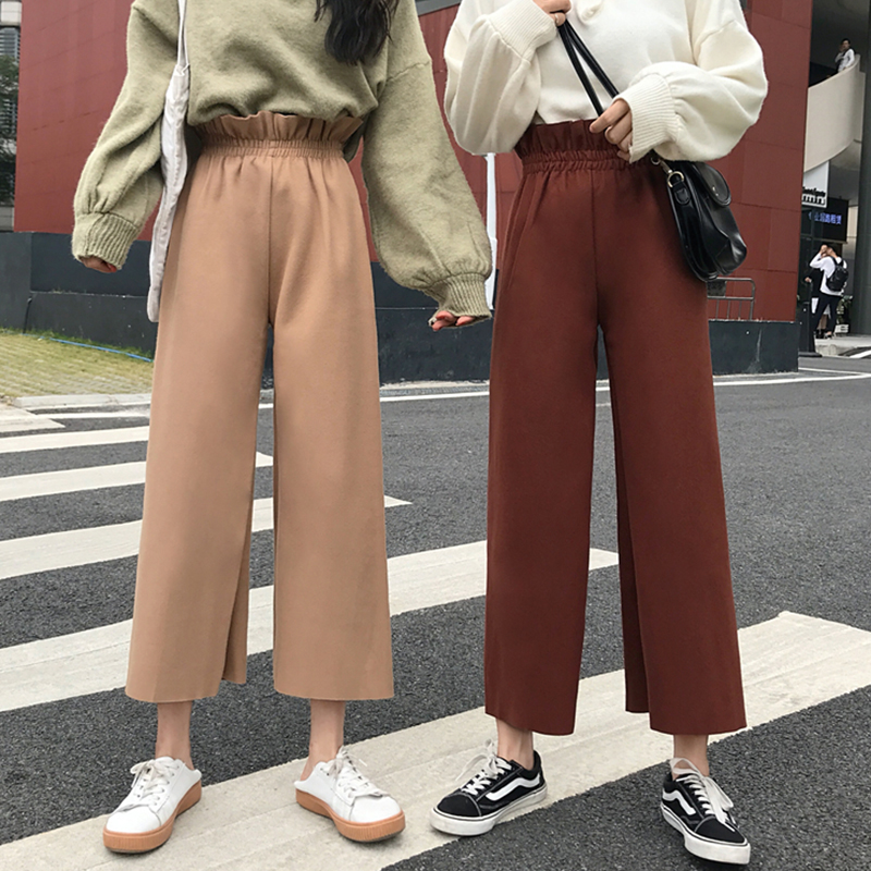 / 寬松闊腿毛呢休閑褲子女秋冬裝新款韓版學生高腰顯瘦復古純色長褲