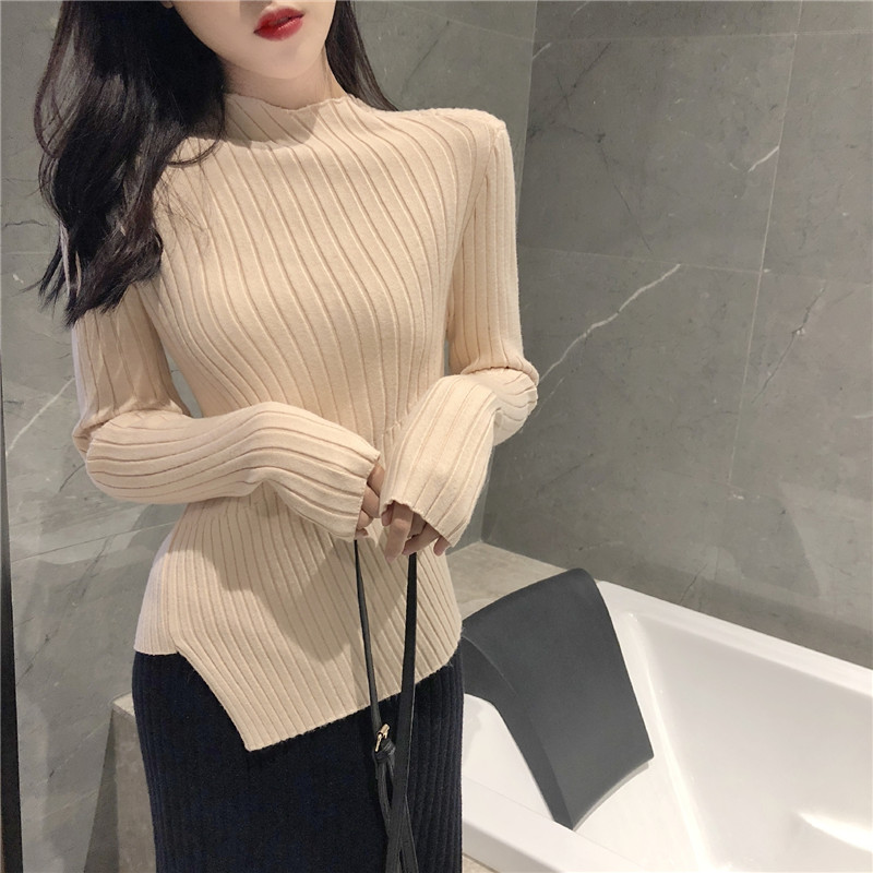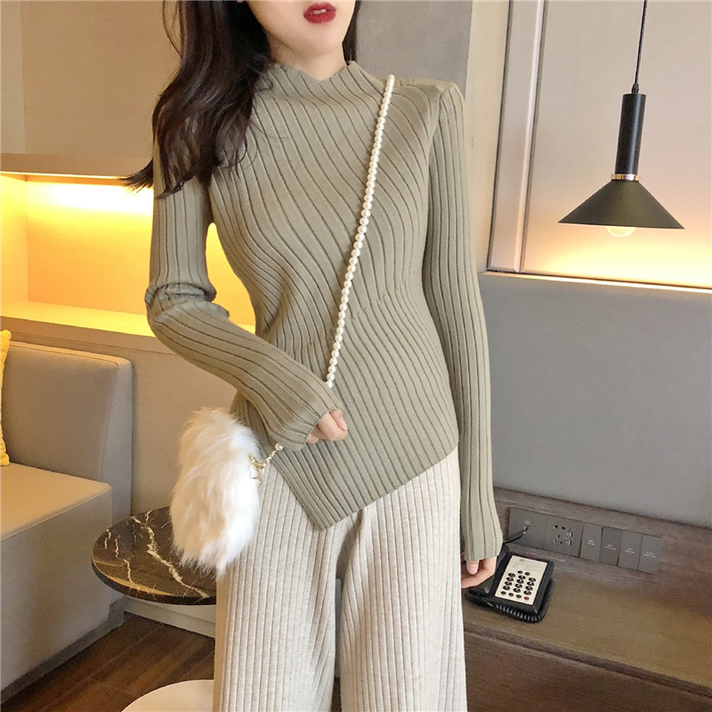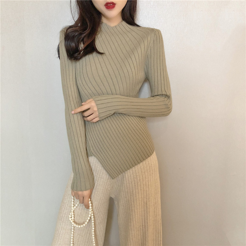 chic秋冬毛衣女慵懶風韓版修身顯瘦不規則坑條針織衫女純色打底衫