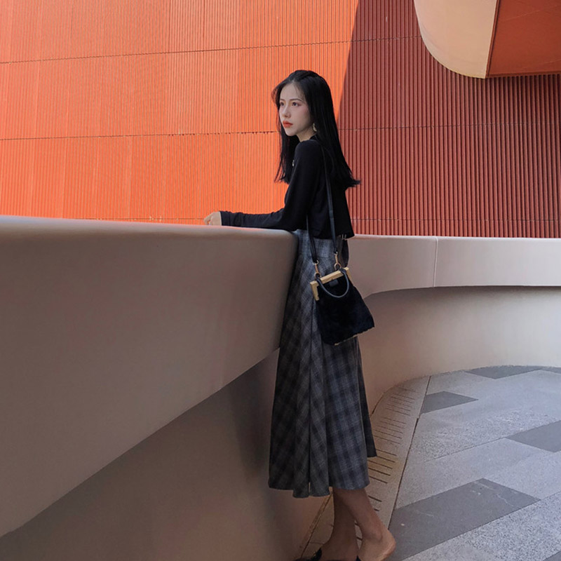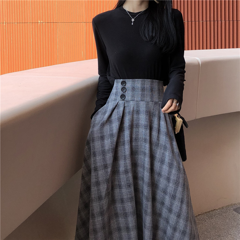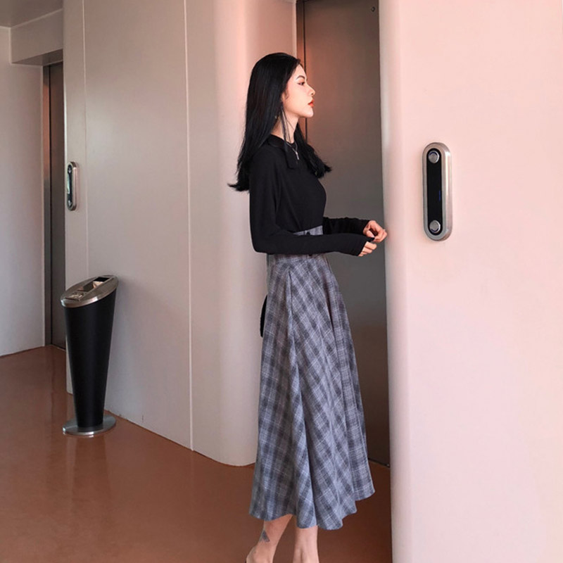 / 韓版秋裝女2018新款套裝純色長袖T+高腰韓版格紋復古中長款半身裙