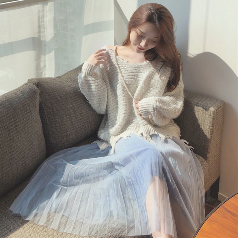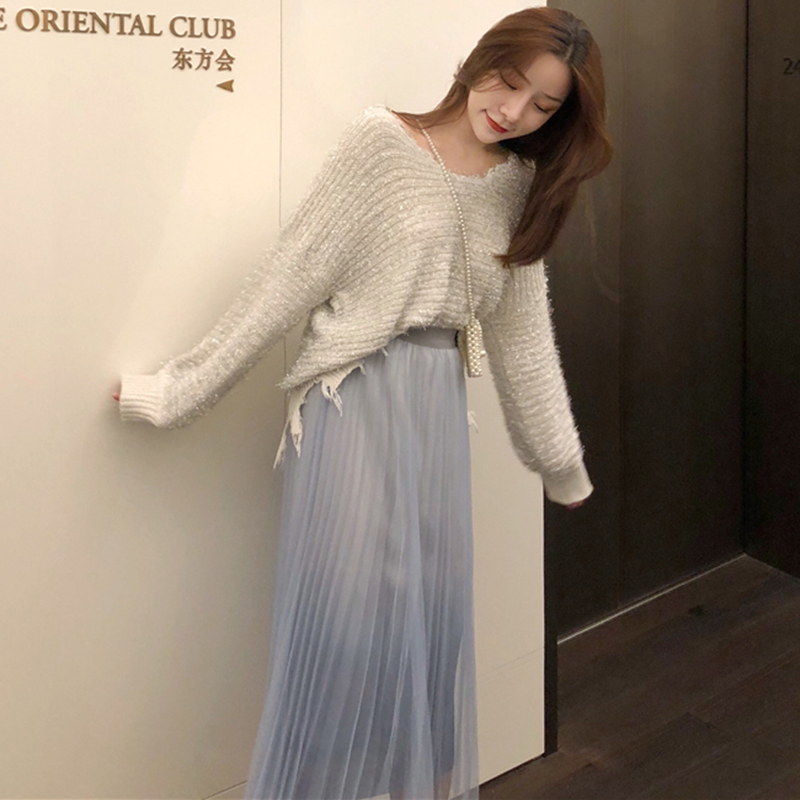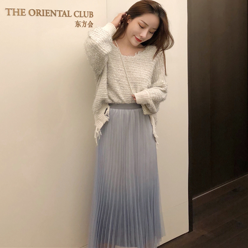 / 御姐套裝女秋冬新款時尚流蘇亮絲慵懶毛衣漸變色網紗A字半身裙子