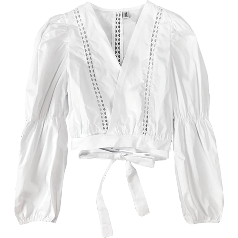 / 氣質泡泡袖露臍上衣早秋新款女裝鏤空交叉V領綁帶短款長袖白襯衫