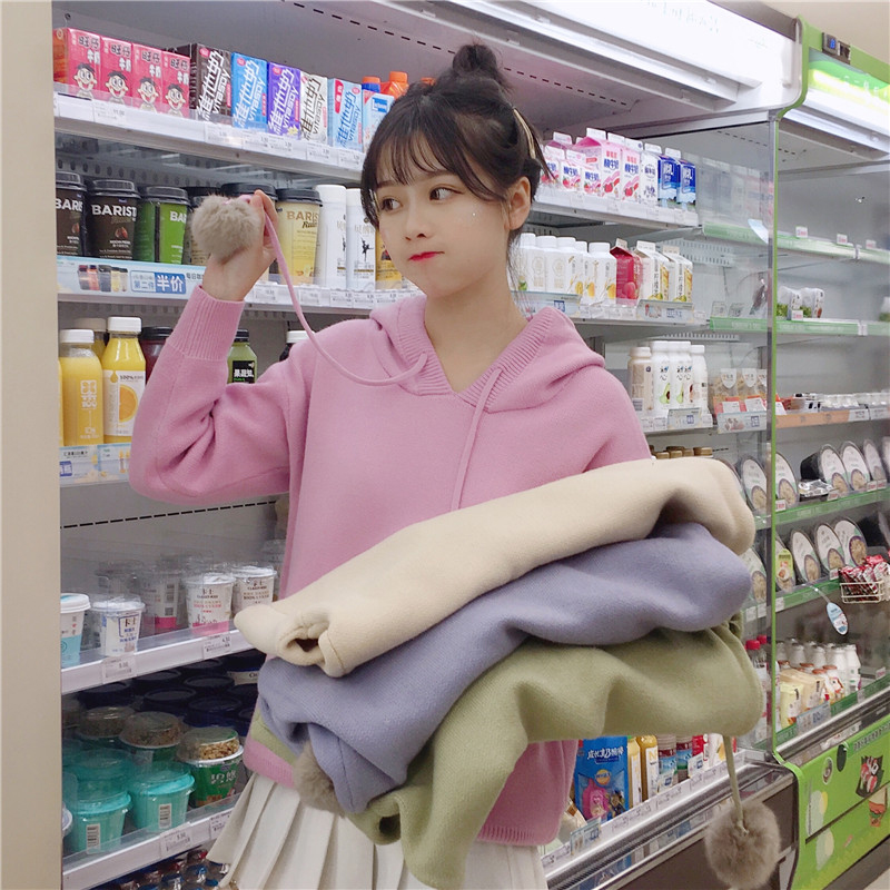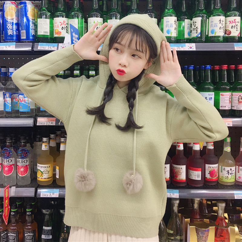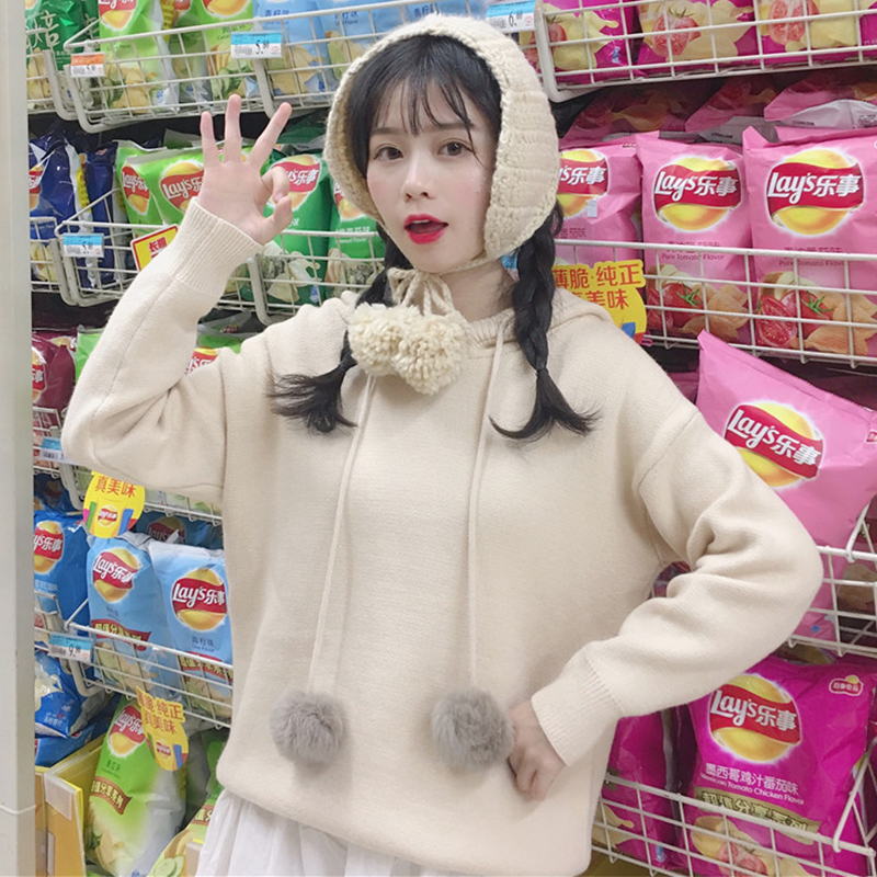 / 學院風可愛套頭毛衣外套女秋冬裝2018新款韓版寬松連帽毛球針織衫