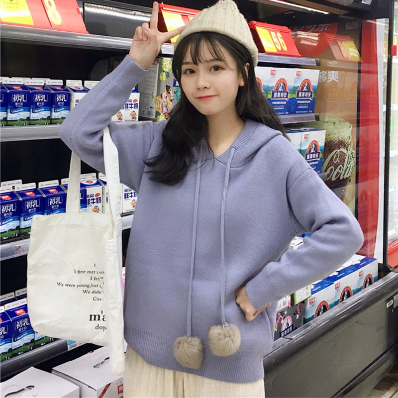 學院風可愛套頭毛衣外套女秋冬裝2018新款韓版寬松連帽毛球針織衫