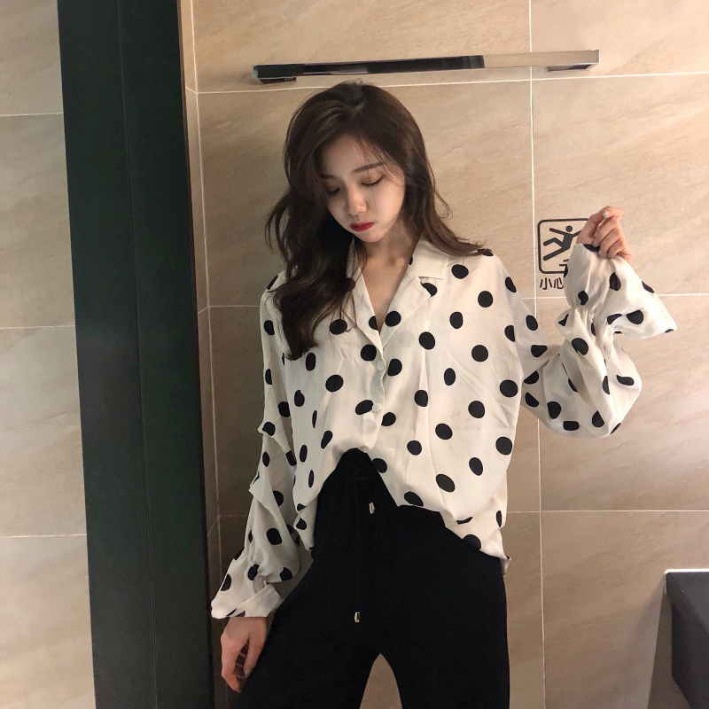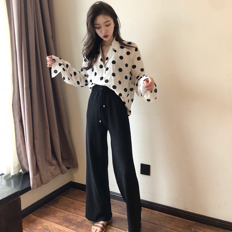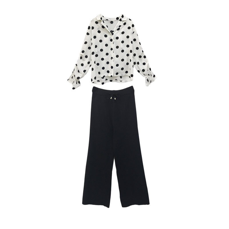 / 秋季新款女裝波點雪紡長袖百搭襯衫顯瘦打底衫+高腰休閑針織長褲