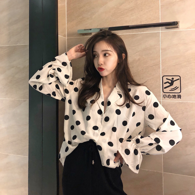 秋季新款女裝波點雪紡長袖百搭襯衫顯瘦打底衫+高腰休閑針織長褲
