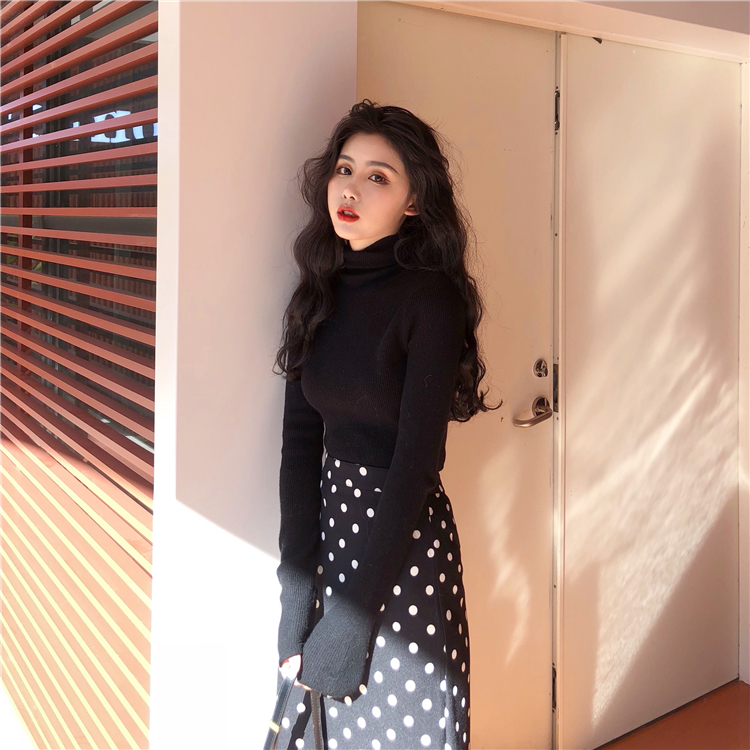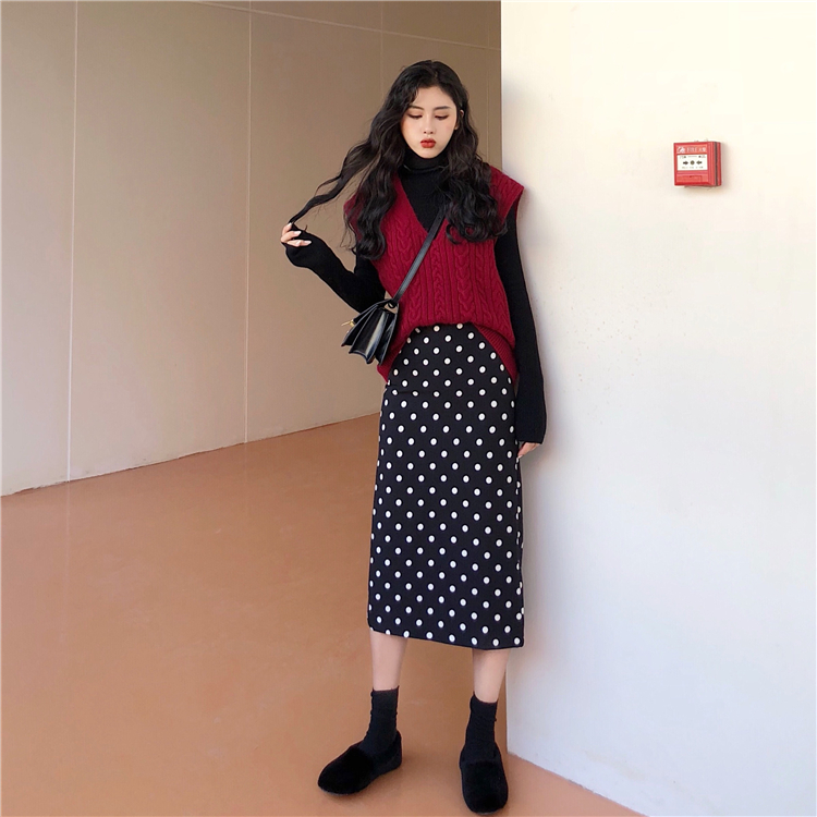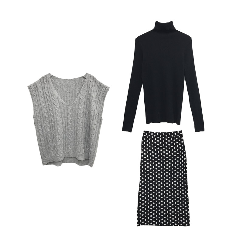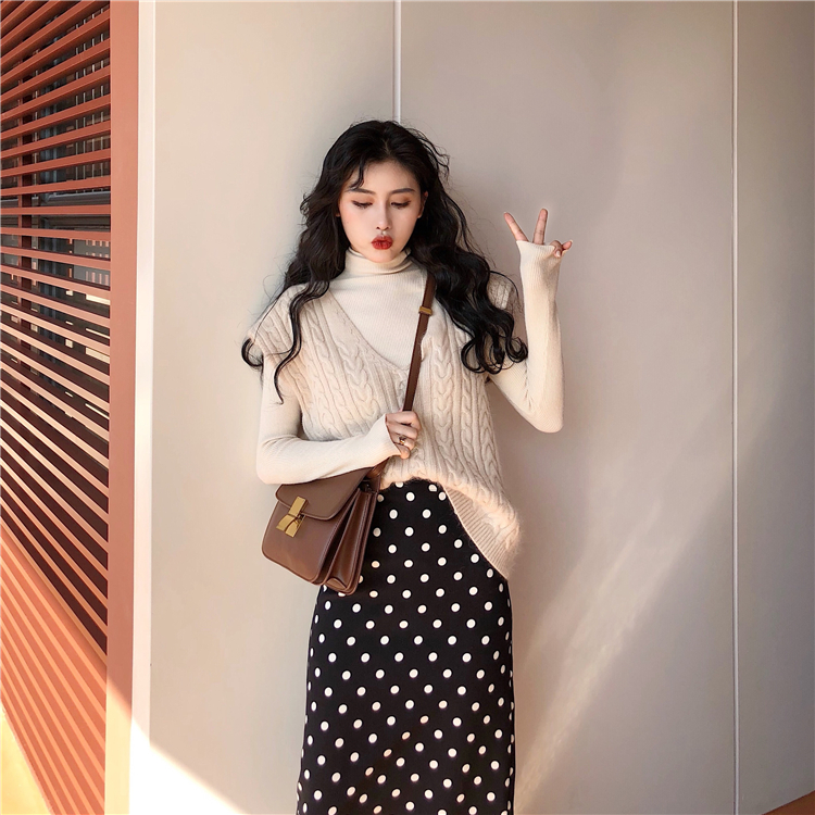 女神套裝秋季無袖毛衣馬甲+長袖打底衫T恤+高腰波點裙子三件套裝