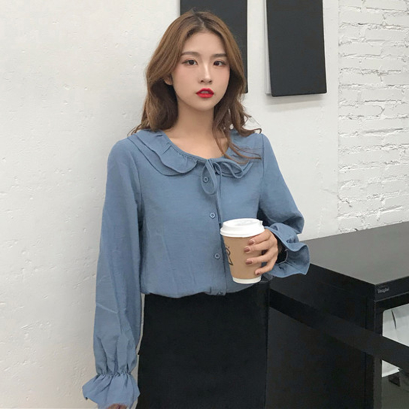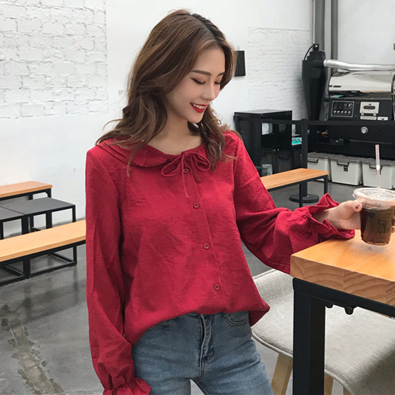 / 燈芯絨襯衣女秋冬裝2018新款韓版時尚百搭寬松荷葉領喇叭長袖襯衫