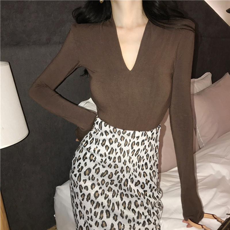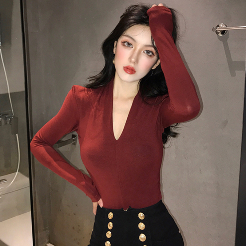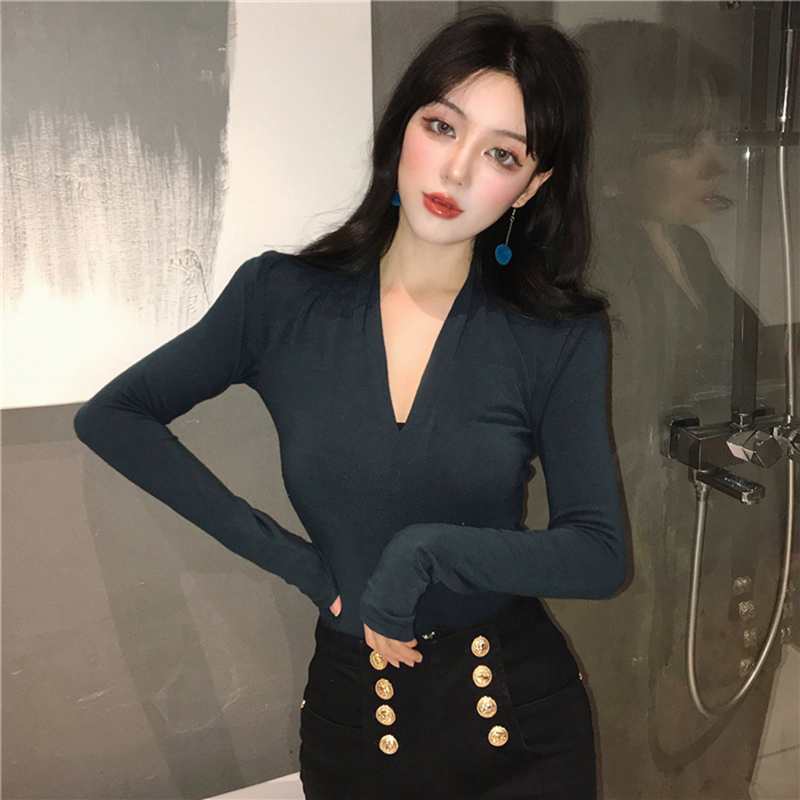 港味chic長袖打底衫女秋冬裝2018新款韓版氣質v領修身顯瘦T恤上衣