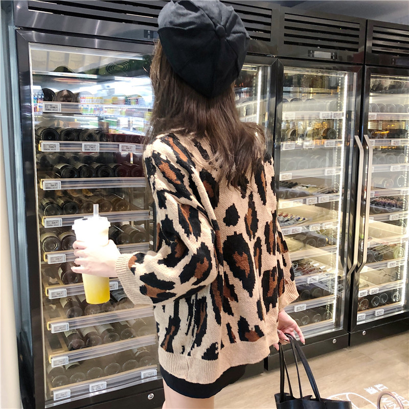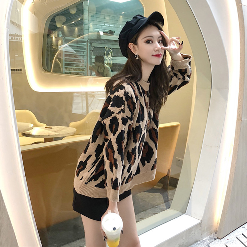 慵懶風套頭毛衣外套女秋冬裝2018新款韓版時尚寬松豹紋長袖針織衫