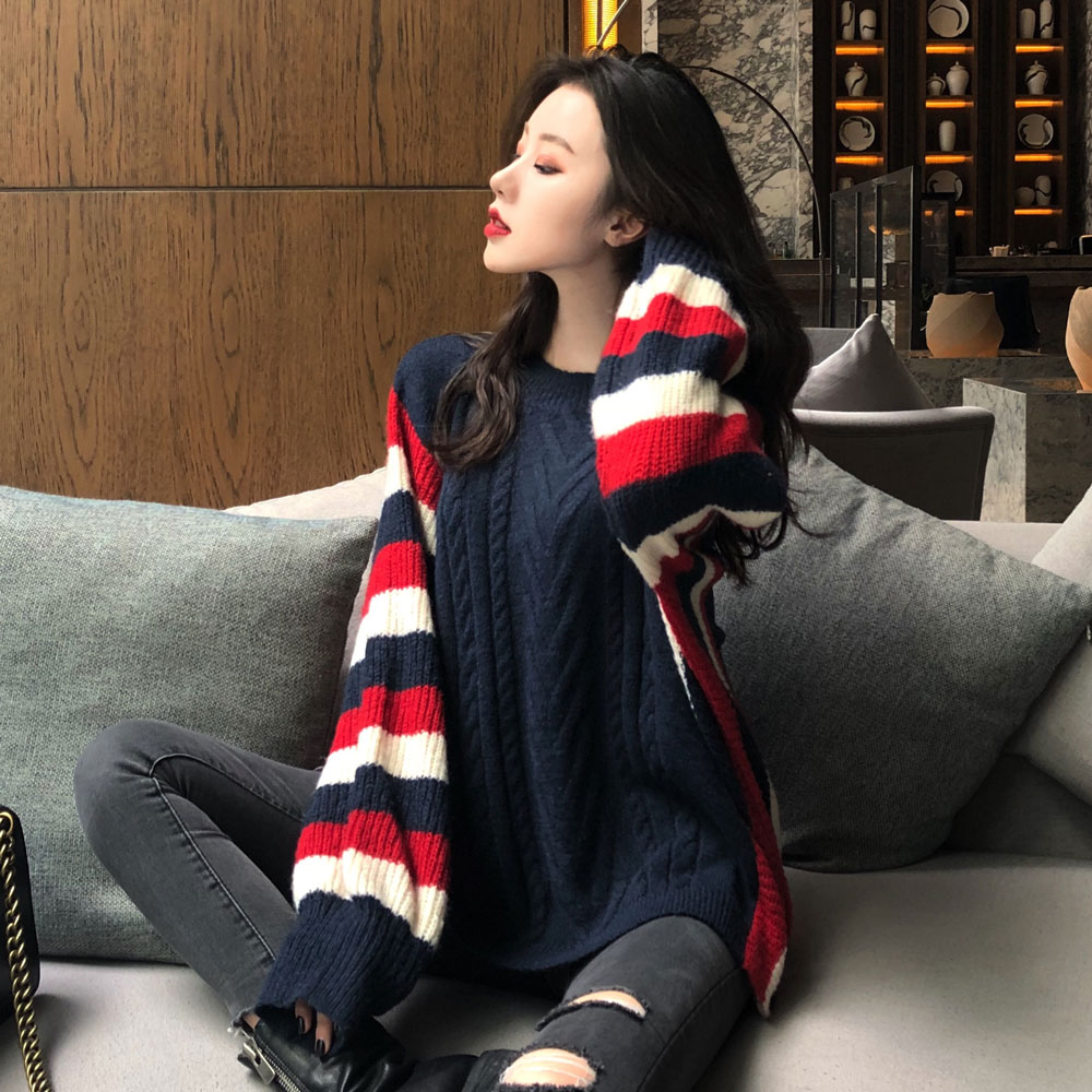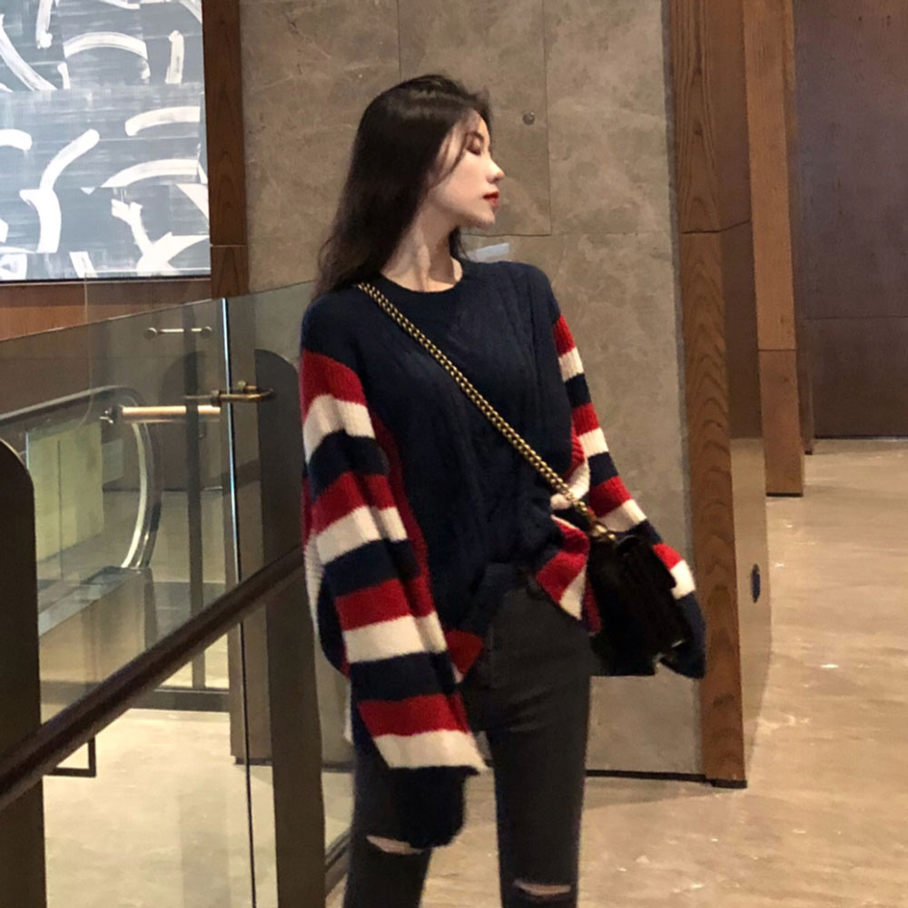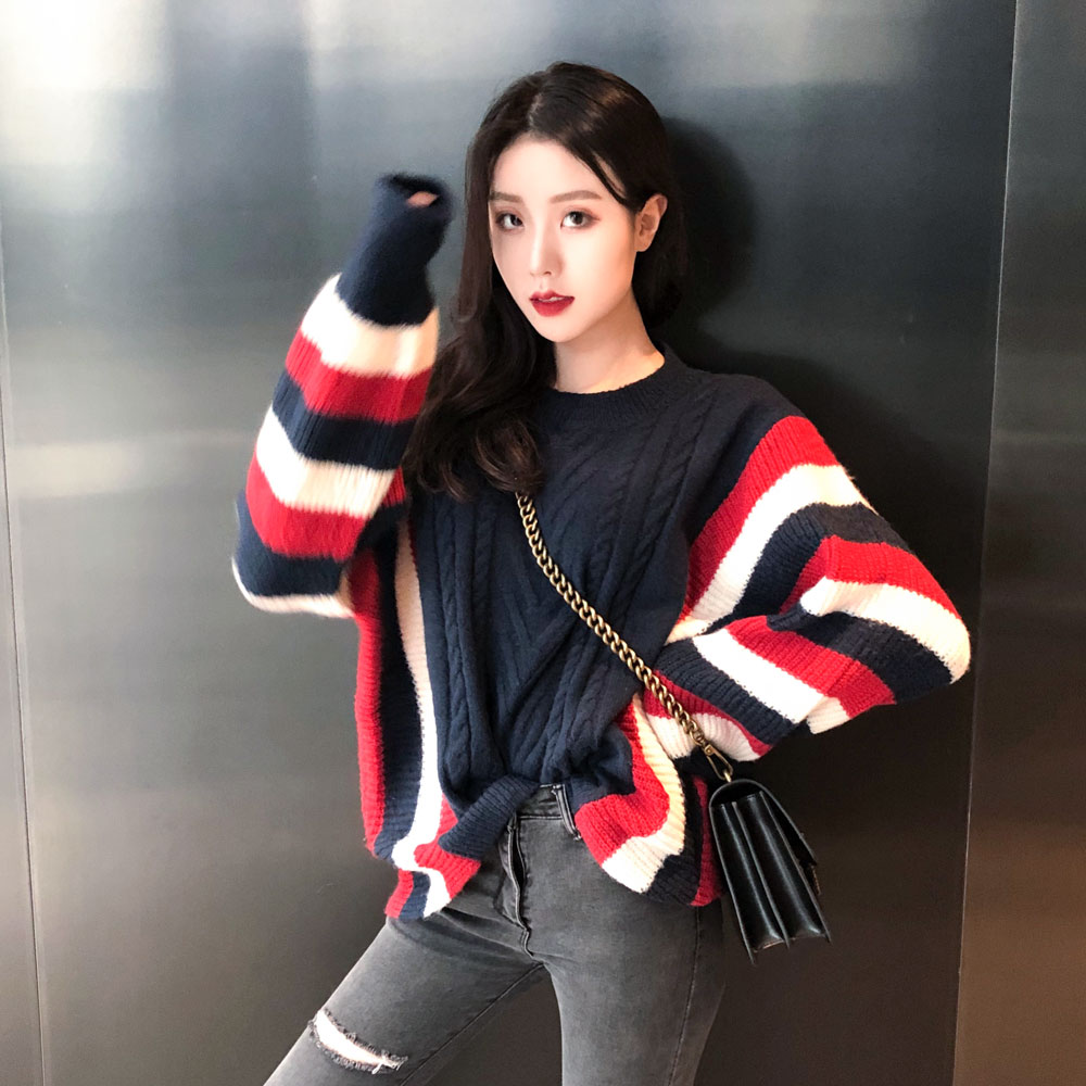 / 港味時尚復古撞色寬松套頭保暖針織毛衣女秋冬2018新款長袖上衣女
