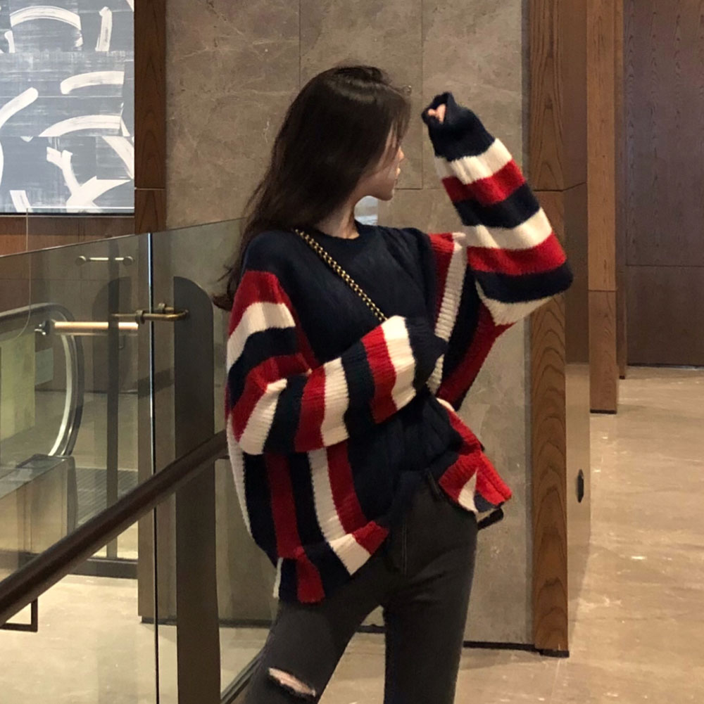 慵懶風網紅毛衣女2018新款韓版寬松撞色網格條紋長袖針織毛線衫潮