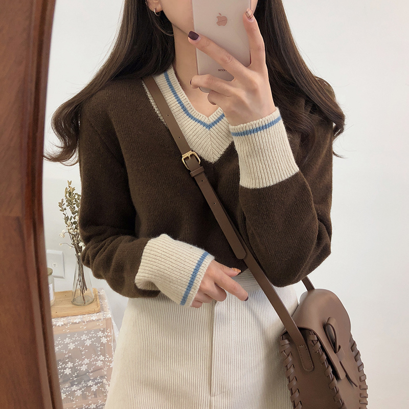 / 韓國慵懶風套頭毛衣女冬2018新款復古百搭條紋撞色V領長袖打底衫