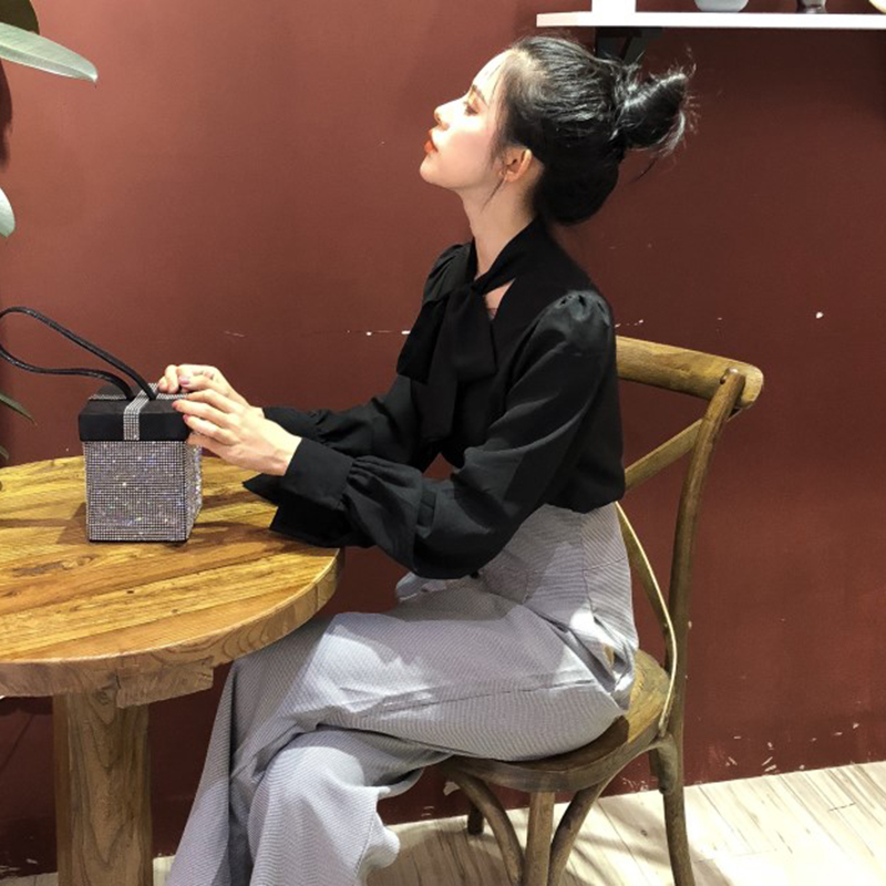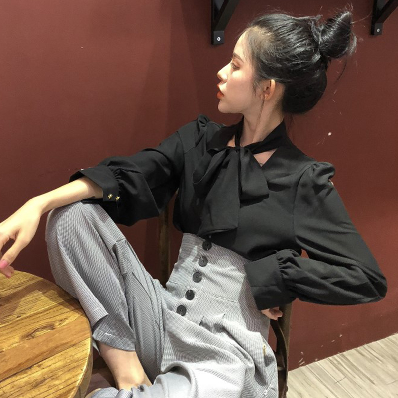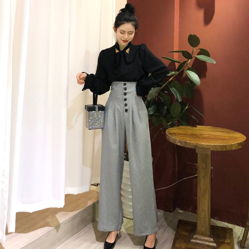 / 韓版時尚套裝女秋新款氣質雪紡長袖上衣+高腰排扣闊腿長褲兩件套