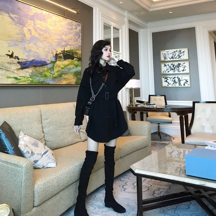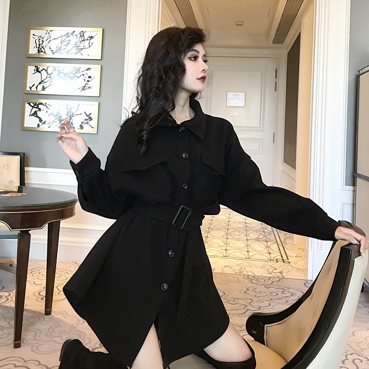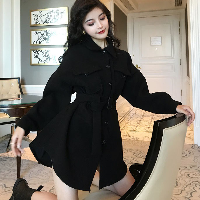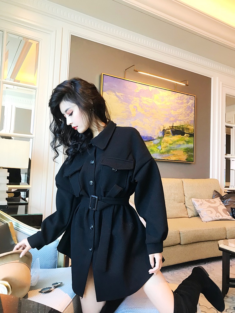 外套女春秋2018新款時尚chic簡約寬松顯瘦中長款呢子外套女配腰帶