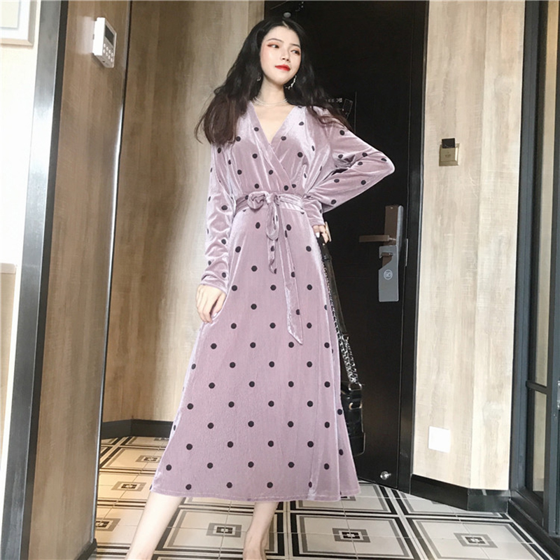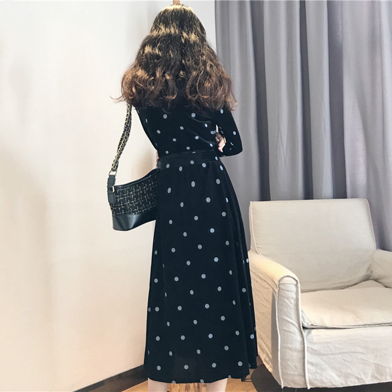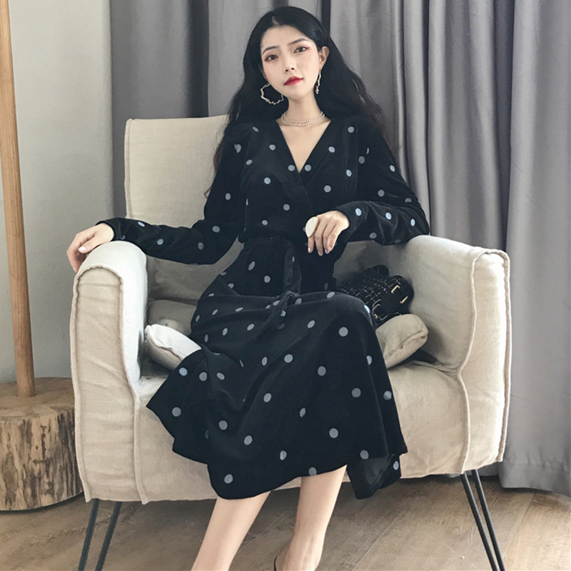 / 復古風波點燈芯絨V領長袖連衣裙秋冬裝新款高腰法式少女茶歇裙子