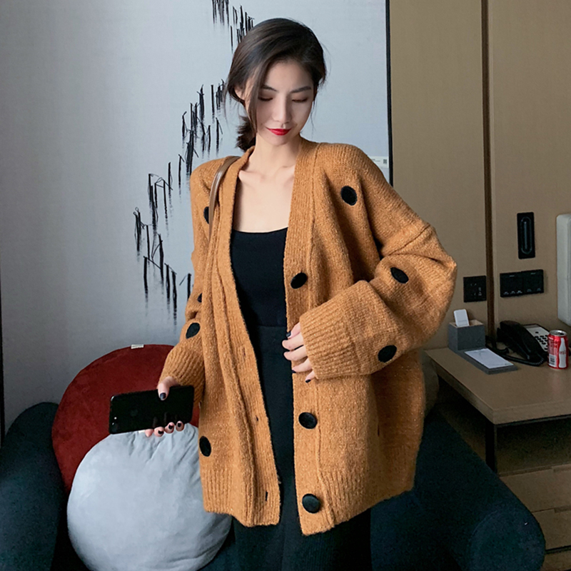 chic慵懶寬松V領針織開衫女秋冬裝2018新款韓版時尚波點毛衣外套