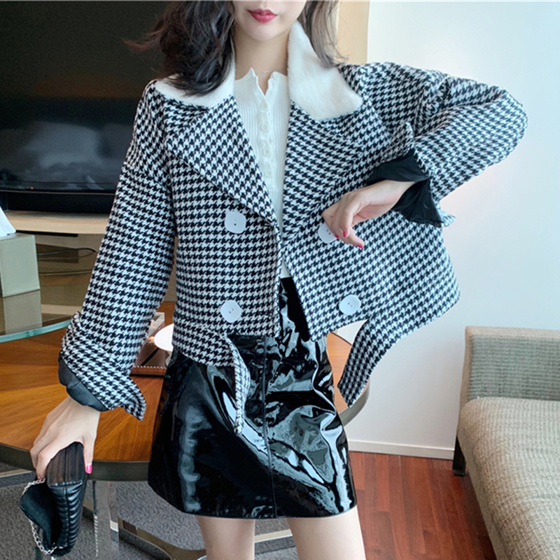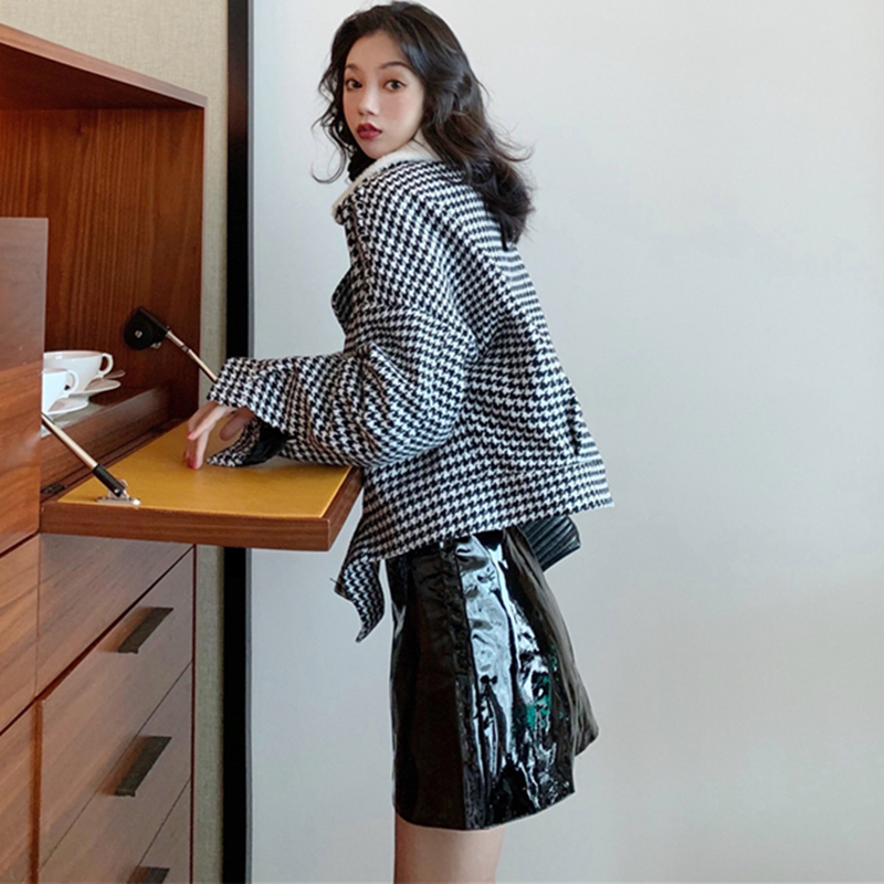/ 翻領格子毛呢短外套秋冬女裝2018新款港風學生寬松開衫休閑上衣潮