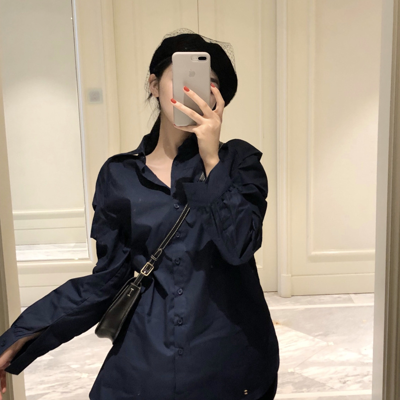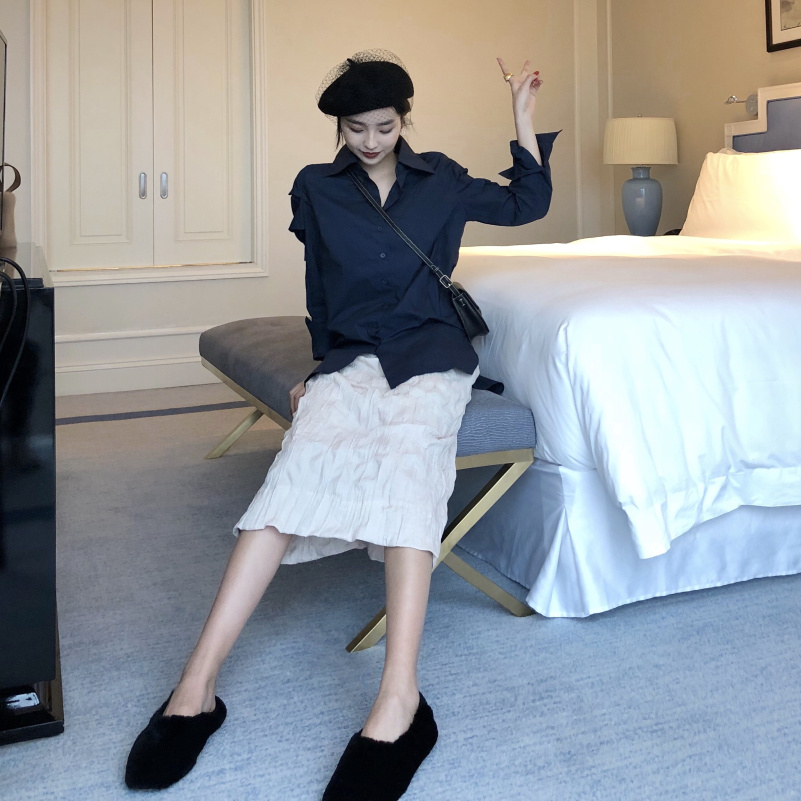 / 秋冬新款韓版袖子設計感寬松長袖襯衫+高腰褶皺中長款半身裙套裝