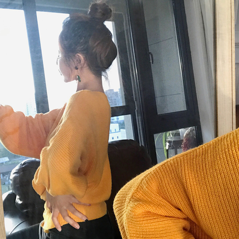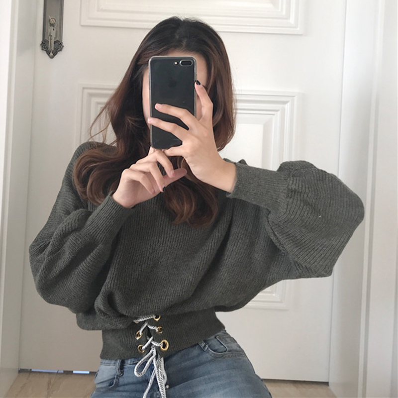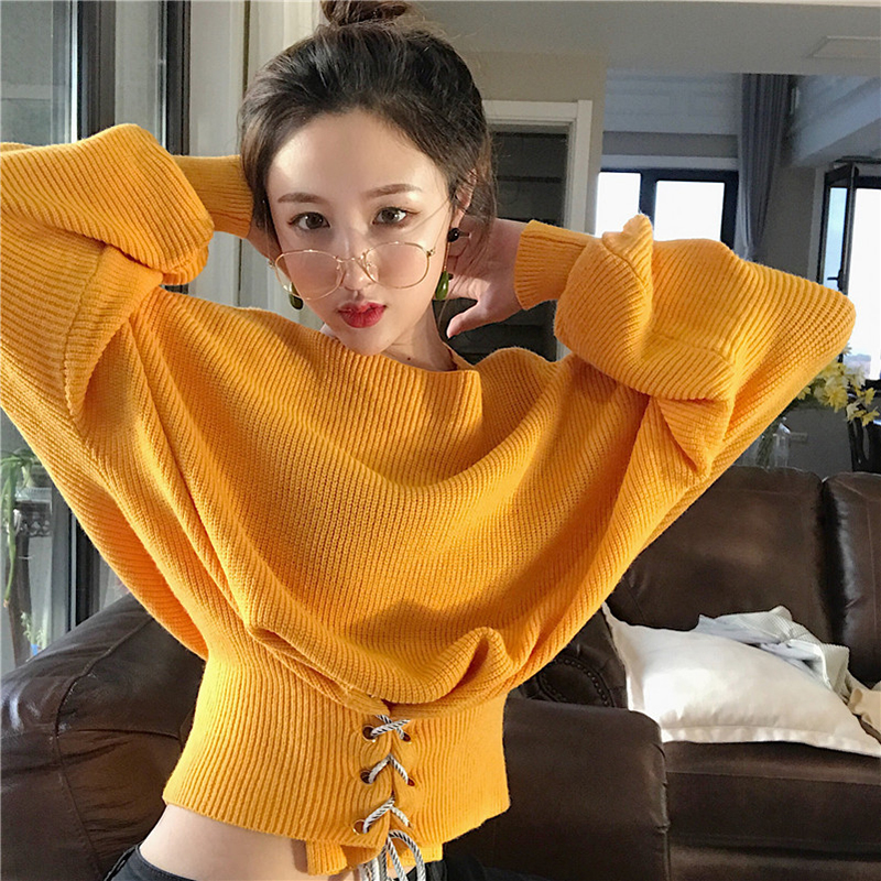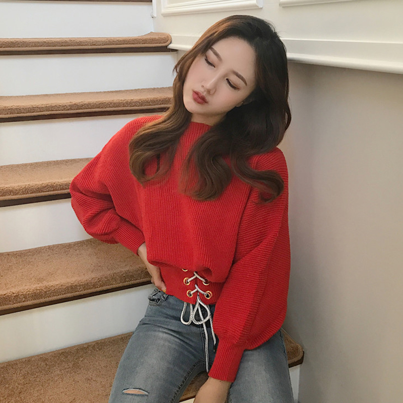 / 秋裝女2018新款純色寬松收腰系帶長袖毛衣學生高腰露臍短款上衣潮