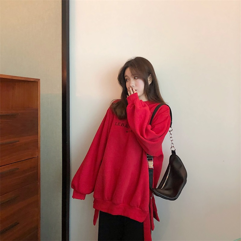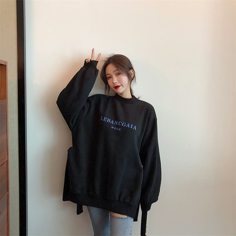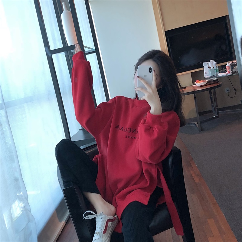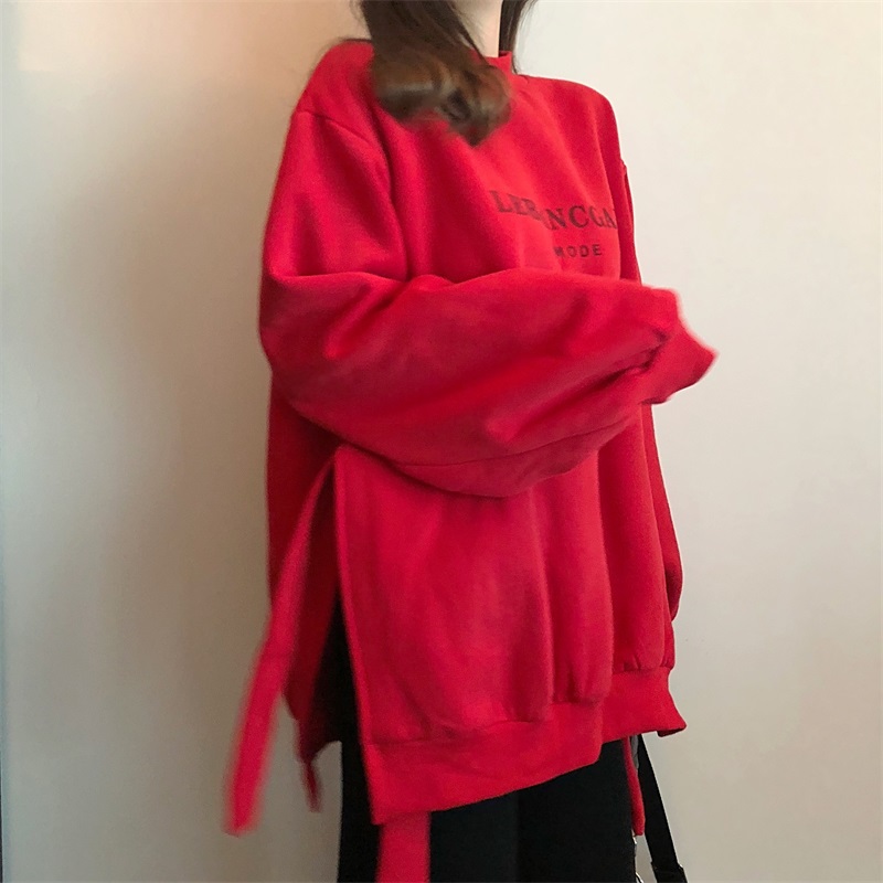 / 慵懶風上衣女寬松顯瘦加絨加厚圓領側開叉綁帶長袖套頭衛衣女外套